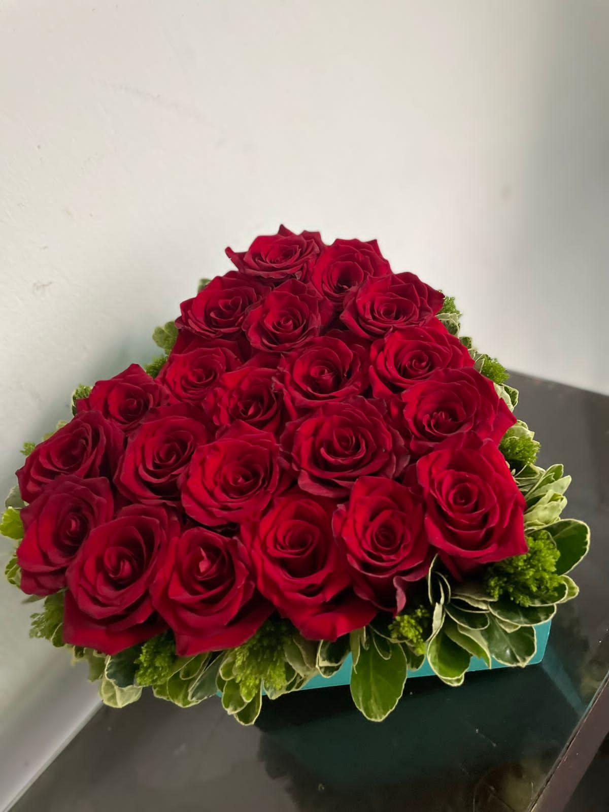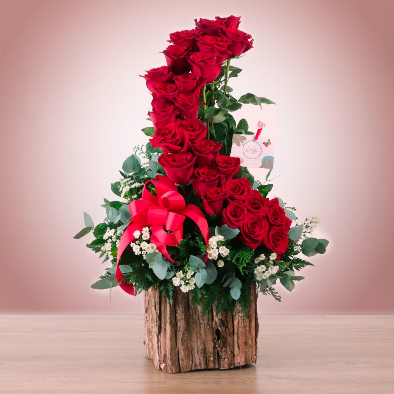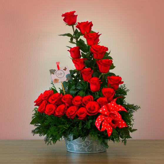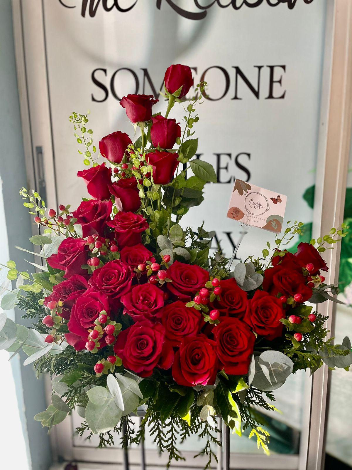 OPCIÓN A: ARREGLO FLORAL DE 24 ROSAS, FLOR DE COMPLEMENTO Y DIFERENTES TIPOS DE FOLLAJES. $90.00