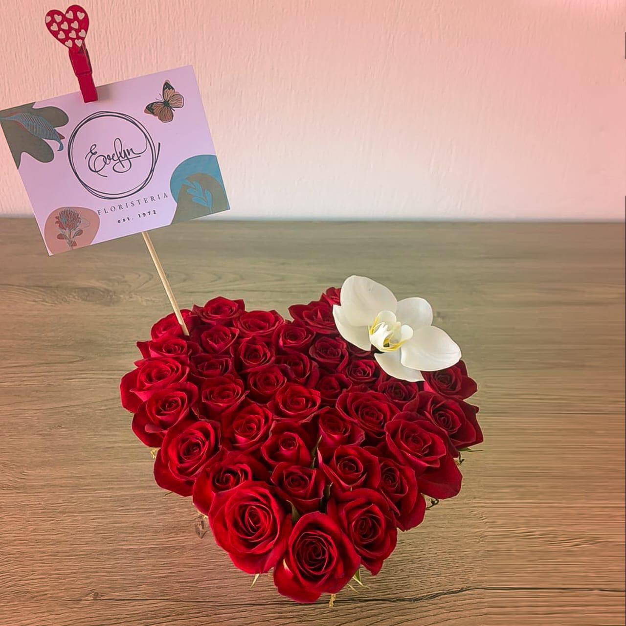 OPCIÓN A: BASE PEQUEÑA EN FORMA DE CORAZÓN CON BABY ROSES Y FLOR DE ORQUÍDEA INDIVIDUAL. $40.00