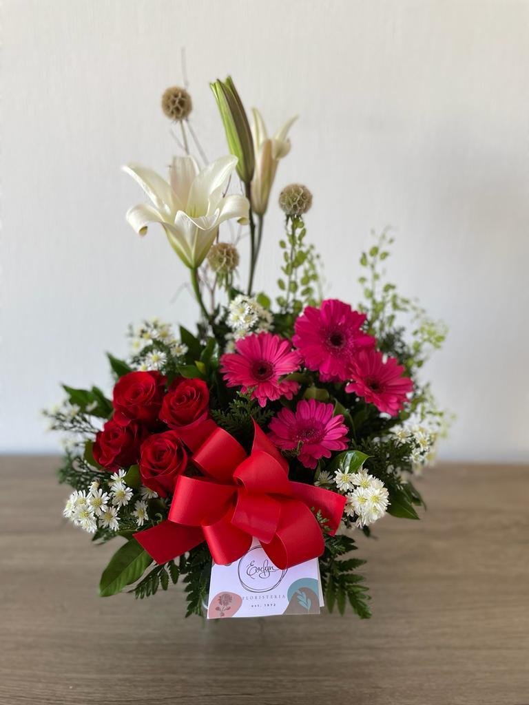 OPCION A: ARREGLO FLORAL CON LIRIOS, 12 ROSAS FLOR DE COMPLEMENTO Y DIFERENTES TIPOS DE FOLLAJES. $85.00