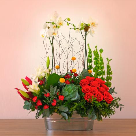 OPCION A: ARREGLO FLORAL CON 2 PLANTAS DE ORQUÍDEAS, 12 ROSAS, LIRIOS, DRAGONES, SUCULENTAS, FLOR DE COMPLEMENTO Y VARIEDAD DE FOLLAJES. $205.00