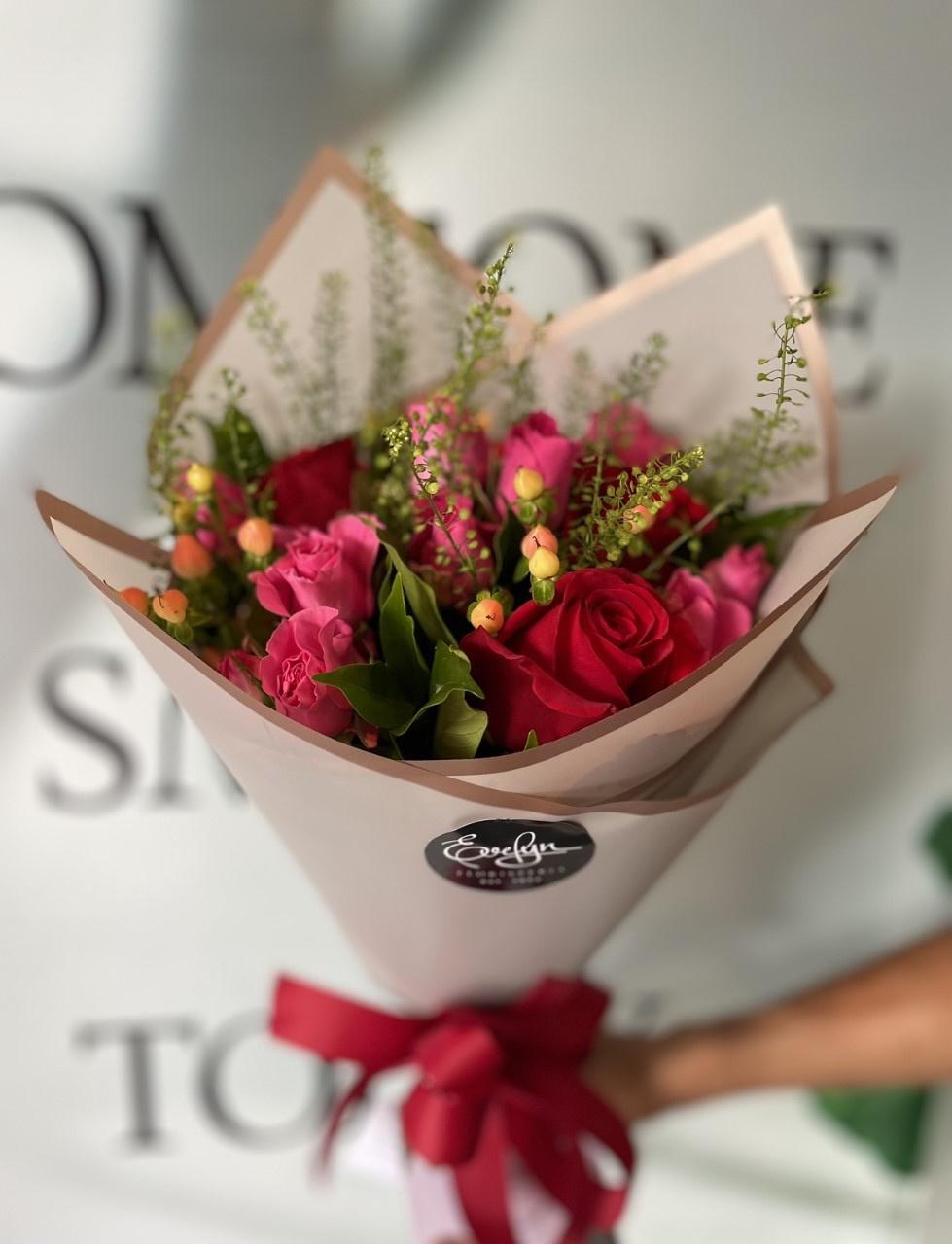OPCION A: RAMO DE MANO CON 6 ROSAS, BABY ROSES, FLOR DE COMPLEMENTO, VARIEDAD DE FOLLAJES ENVOLTURA DE PAPEL COREANO. $30.00