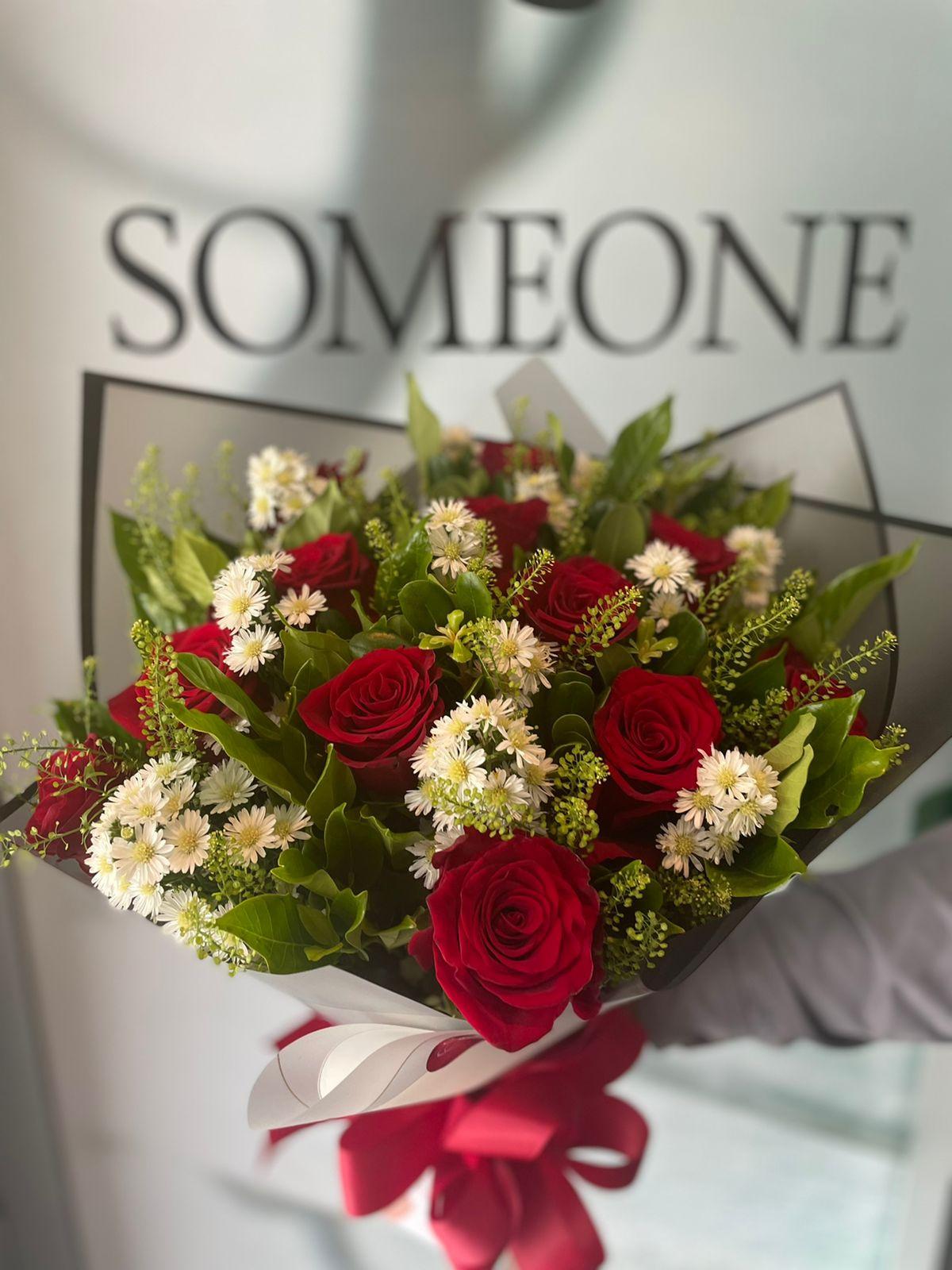 OPCION A: ARREGLO FLORAL DE 12 ROSAS, 5 RANUNCULOS, BABY ROSE, FLORES DE COMPLEMENTO Y DIFERENTES TIPOS DE FOLLAJES. $100.00
