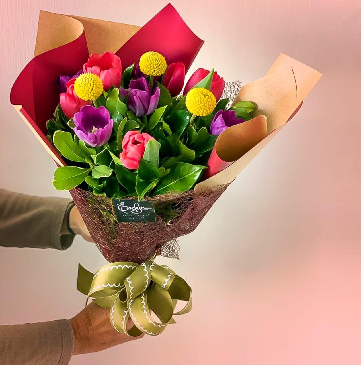OPCIÓN A: RAMO DE MANO DE 10 TULIPANES, FLOR DE COMPLEMENTO Y DIFERENTES TIPOS DE FOLLAJES. $65.00