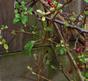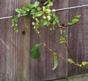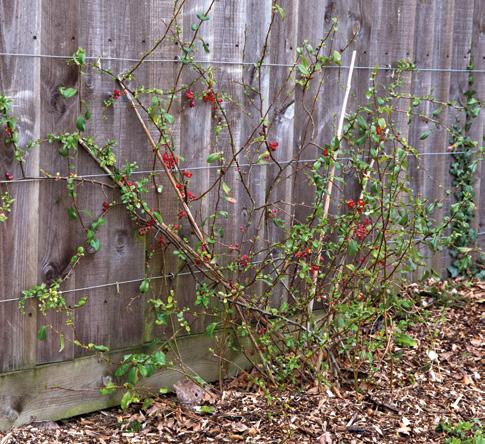 Na een jaar bedekt een gesnoeide dwergkwee al een deel van de schutting waartegen hij wordt geleidt.