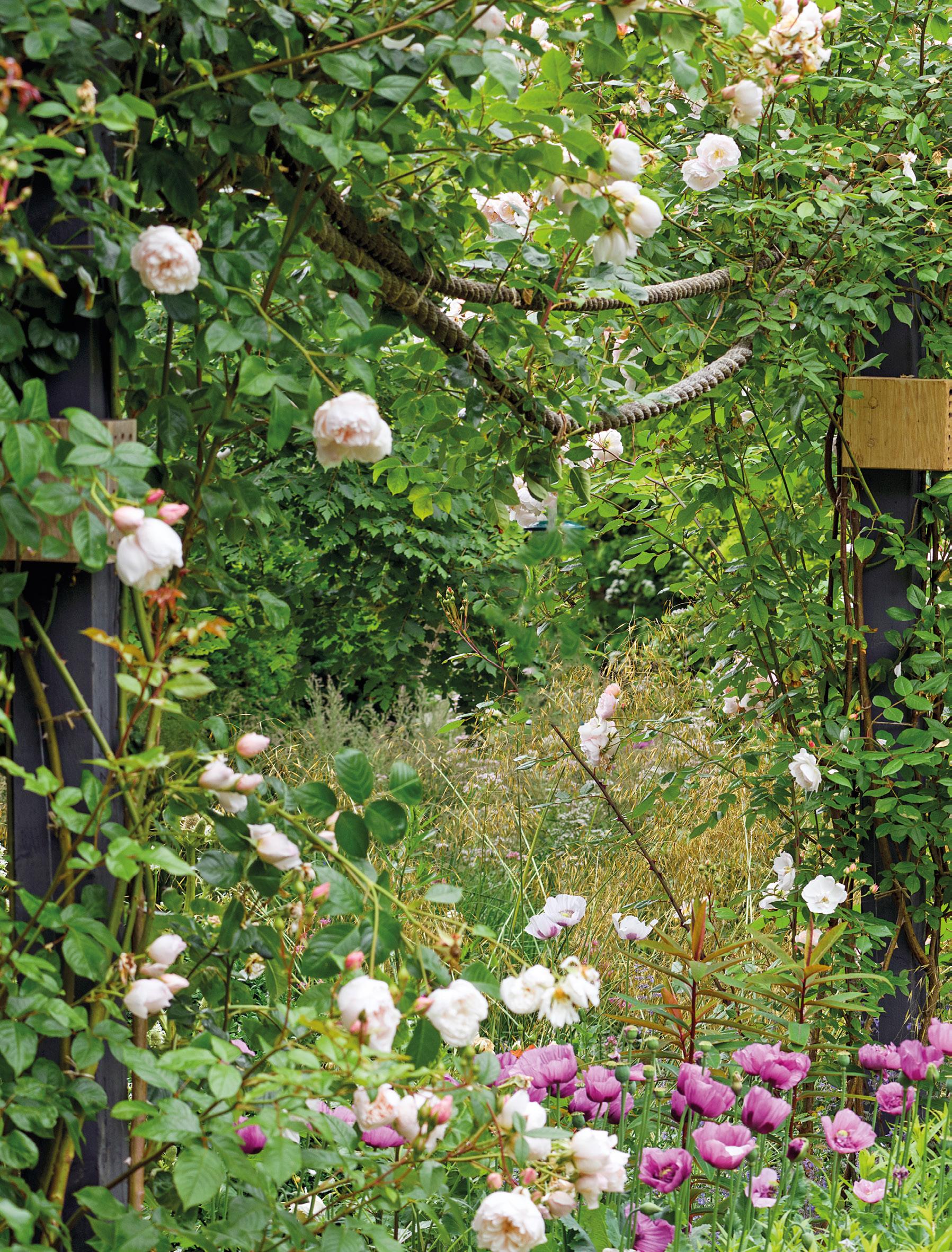 Rozen als een guirlande langs touw leiden is een simpele maar effectieve manier om ze op hun mooist te laten uitkomen.