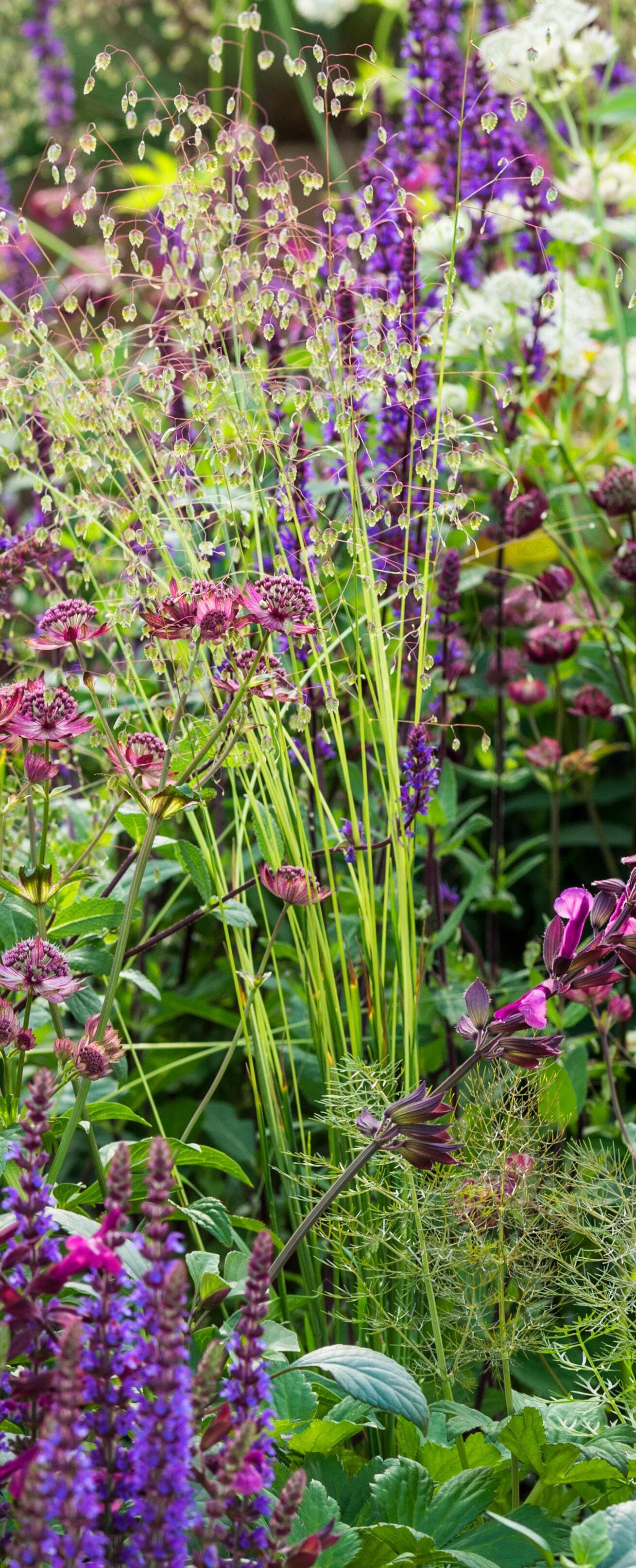 Een van de leukste dingen van deze maand is dat er zoveel te kiezen valt! Er is helaas te weinig ruimte om over alle planten op deze foto te schrijven, dus moeten we een keuze maken. Maar hoe kies je een favoriet als er zoveel zijn? Hier staan drie soorten Astrantia’s, twee Salvia’s en een grassoort op één foto. We voelen ons als een kind in een snoepwinkel, letterlijk. Pak maar wat je pakken kan in de Jaminwinkel. Zoveel suiker, zo weinig tijd.