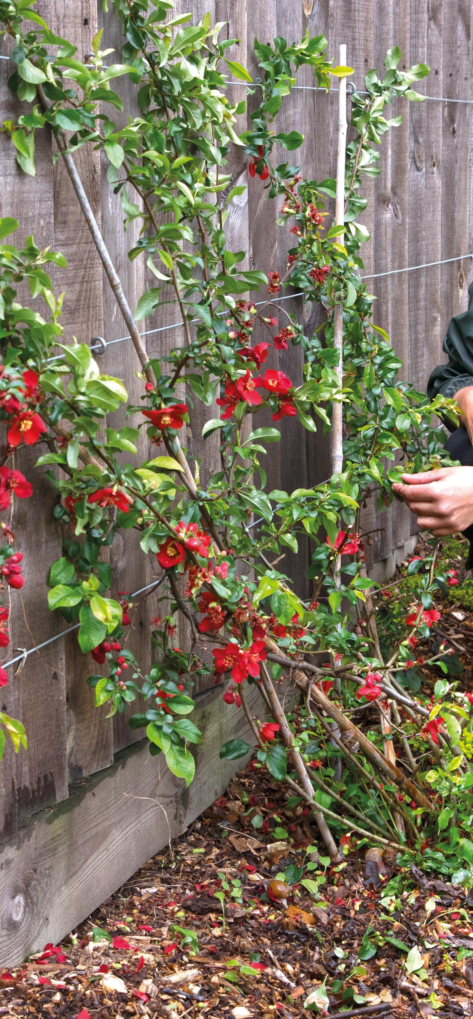 Leid een dwergkwee aan het einde van zijn bloeiperiode tegen een schutting of muur, want nu de jonge scheuten nog buigzaam zijn, kun je ze gemakkelijk aanbinden. Verwijder ongewenste takken.