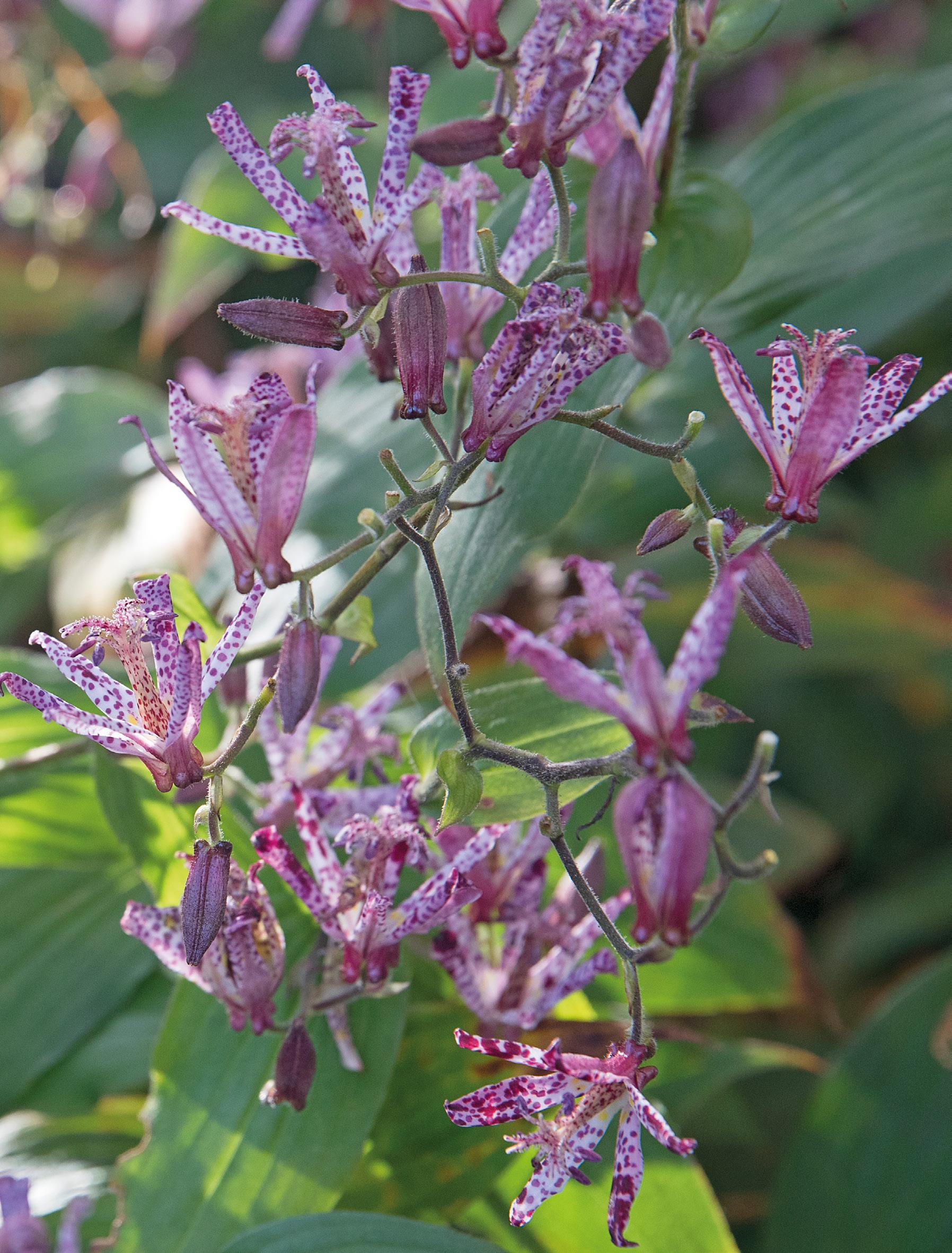 Paddenlelies (Tricyrtis hirta) zijn dol op gevlekte schaduw, waar ze tot laat in de zomer hun ongewone, gespikkelde bloemen produceren. ‘Taiwan Adbane’ heeft bijzonder rijk gekleurde bloemen. Hoogte x Breedte 100 x 45 cm Bloei aug-okt