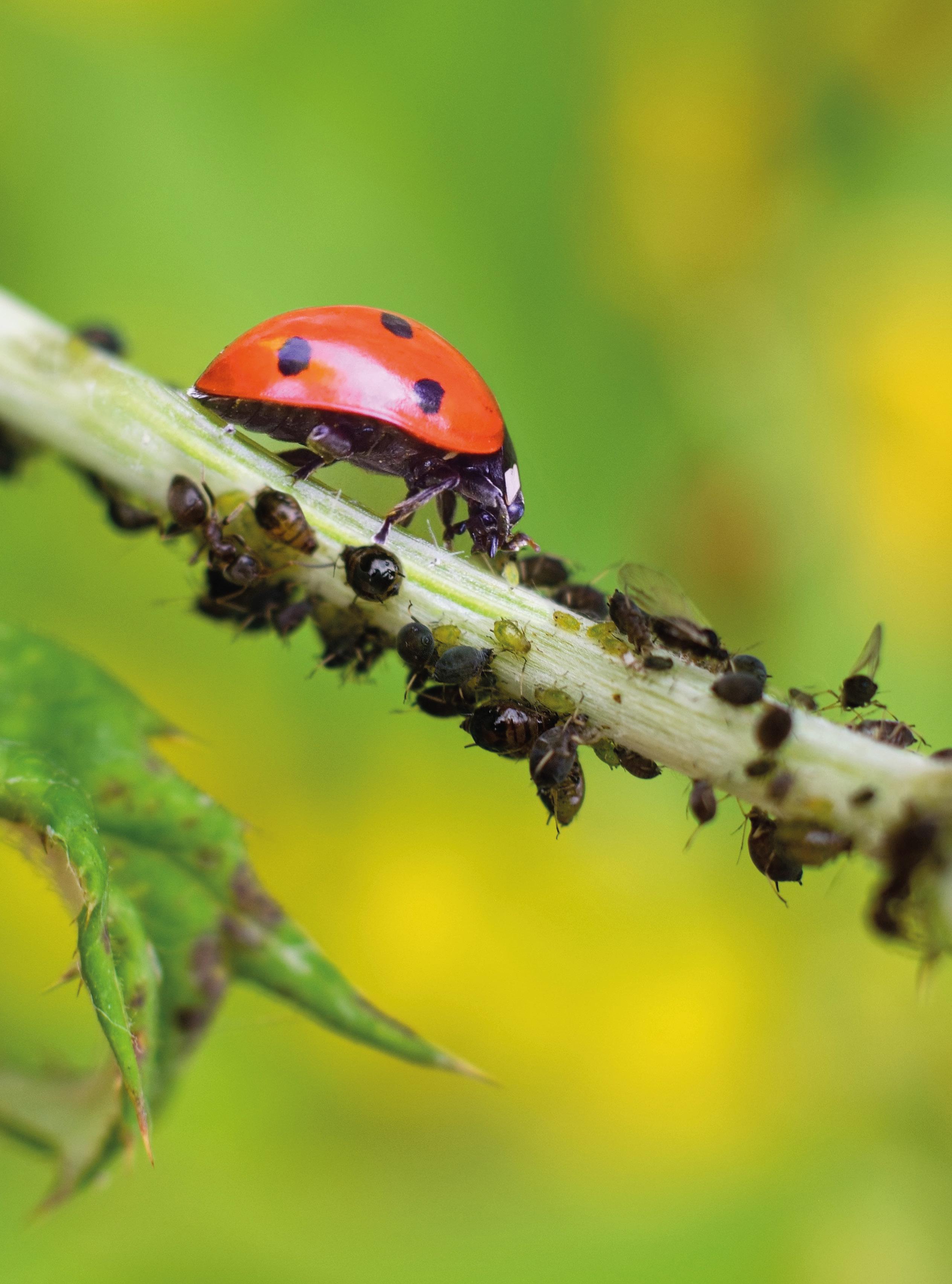 Zorg ervoor dat je tuin een gezond evenwicht tussen roof- en prooidieren kan ontwikkelen. Dan zal een bladluizenplaag al snel lieveheersbeestjes aantrekken en afnemen.
