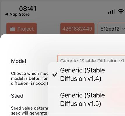 In Draw Things valt er heel wat in te stellen onder deze knop. Je kiest hier welke AI je wilt gebruiken (zie stap 6), maar ook hoeveel stappen de AI moet doorlopen voordat je de afbeelding te zien krijgt. Hoe meer stappen, hoe beter het plaatje – maar ook hoe langer de laadtijd. Bovendien stel je hier de ‘Image Size’ in, oftewel hoe hoog de resolutie van de gegenereerde afbeelding moet zijn. Ook hier geldt: hoe hoger de resolutie, hoe langer de laadtijd.