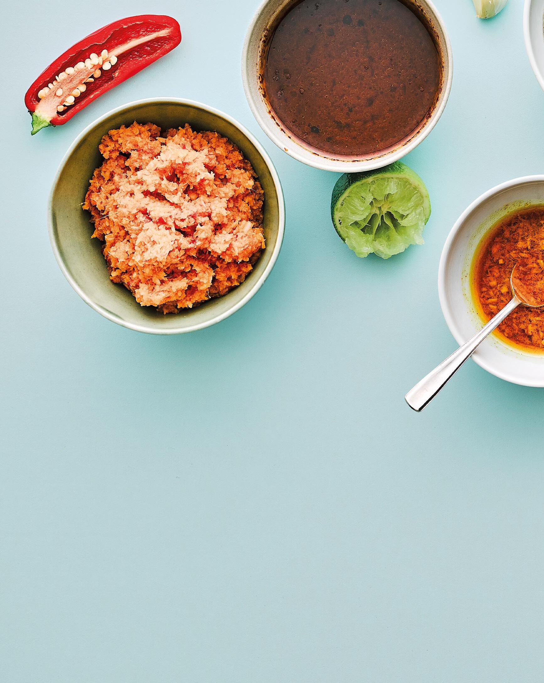 Doe 30 g geraspte gember, 2 grof gehakte rode pepers (verwijder evt. de zaadjes), 7 el sesamolie, 2 el vissaus en 40 g geraspte kokos in een keukenmachine en vermaal alles tot een grove pasta.