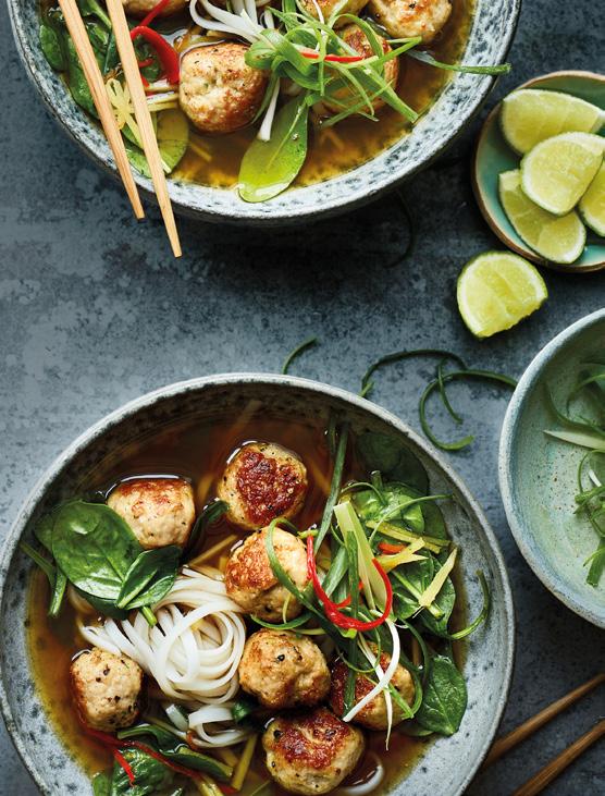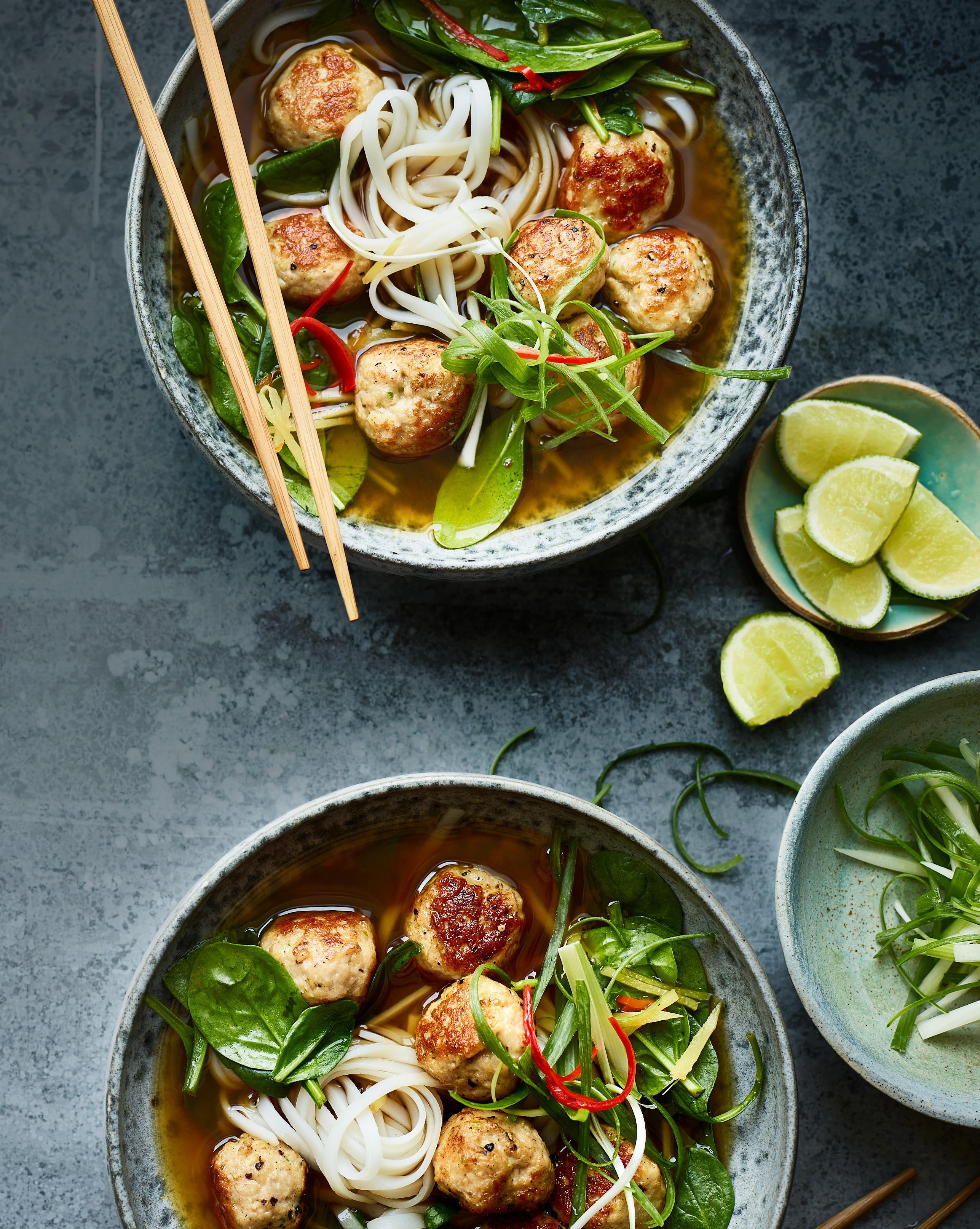 3 Verhit voor de bouillon de kippenbouillon in een steelpan en voeg 1 rode peper, de gember en de knoflook toe. Laat 4 minuten pruttelen. Voeg de gehaktballetjes en de sojasaus toe en laat 3 minuten rustig pruttelen. Voeg de lente-uitjes, de rijstnoedels, de spinazie en de rest van de rode peper toe. Breng op smaak met limoensap. Verdeel over 4 kommen en serveer.