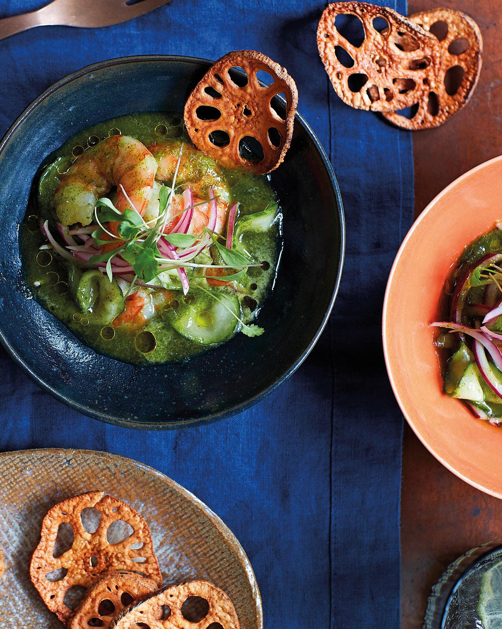 Aquachile betekent chiliwater en is de Mexicaanse variant van de Peruaanse ceviche. Dit is de Nikkei-versie, waarbij naast het traditionele limoensap ook Japans yuzusap is toegevoegd, plus een scheutje vissaus en mirin voor een Aziatische twist op deze Mexicaanse klassieker. Je kunt plakjes rauwe zeebaars- of zeebrasemfilet of sint-jacobsschelpen toevoegen in combinatie met de garnalen, maar zorg dat de garnalen het hoofdingrediënt blijven. Gebruik je verse garnalen? Dan moeten ze gepeld zijn, het darmkanaal verwijderd en een keer diepgevroren zijn geweest voordat je ze in dit gerecht verwerkt, om parasieten te doden.