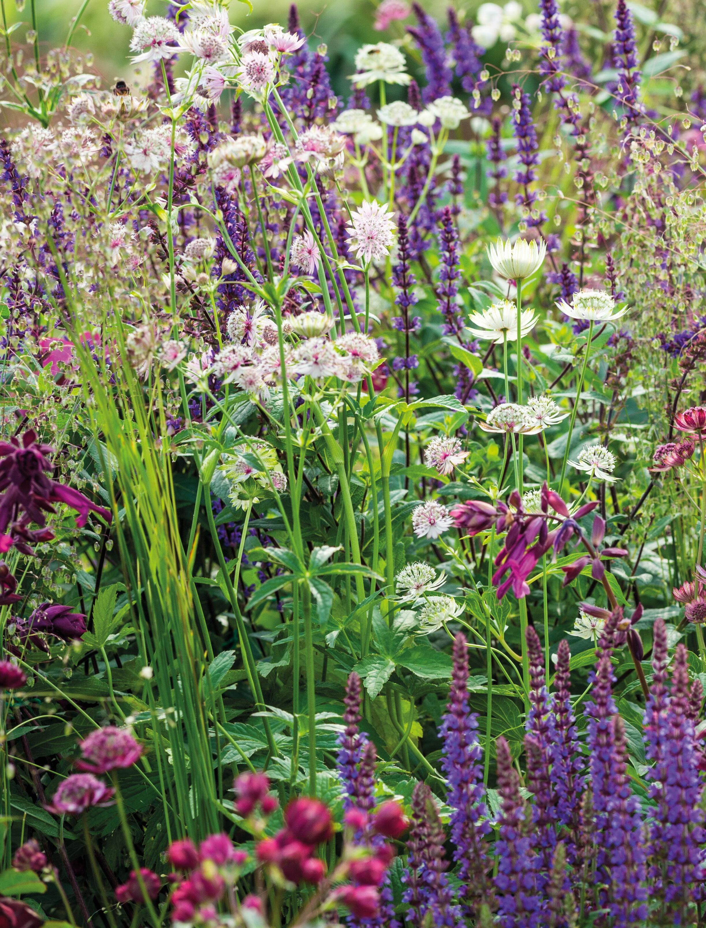 Een van de leukste dingen van deze maand is dat er zoveel te kiezen valt! Er is helaas te weinig ruimte om over alle planten op deze foto te schrijven, dus moeten we een keuze maken. Maar hoe kies je een favoriet als er zoveel zijn? Hier staan drie soorten Astrantia’s, twee Salvia’s en een grassoort op één foto. We voelen ons als een kind in een snoepwinkel, letterlijk. Pak maar wat je pakken kan in de Jaminwinkel. Zoveel suiker, zo weinig tijd.