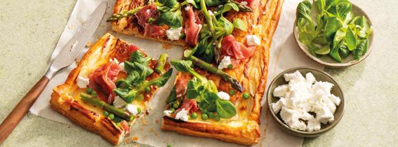 5 Laat de plaattaart kort afkoelen voor je hem gaat beleggen met de overige ingrediënten. Verdeel de veldsla over de bodem van de plaattaart, samen met de groene aspergetips en de doperwten. Drapeer de stukken serranoham erover en maak de lente-plaattaart af met de verkruimelde geitenkaas.