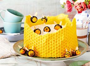 6 Trek het folie voorzichtig van de taart. Breek van de bovenkant voorzichtig wat stukken chocolade af. Versier de taart met de bijtjes. Druppel kort voor het serveren wat honing eroverheen.