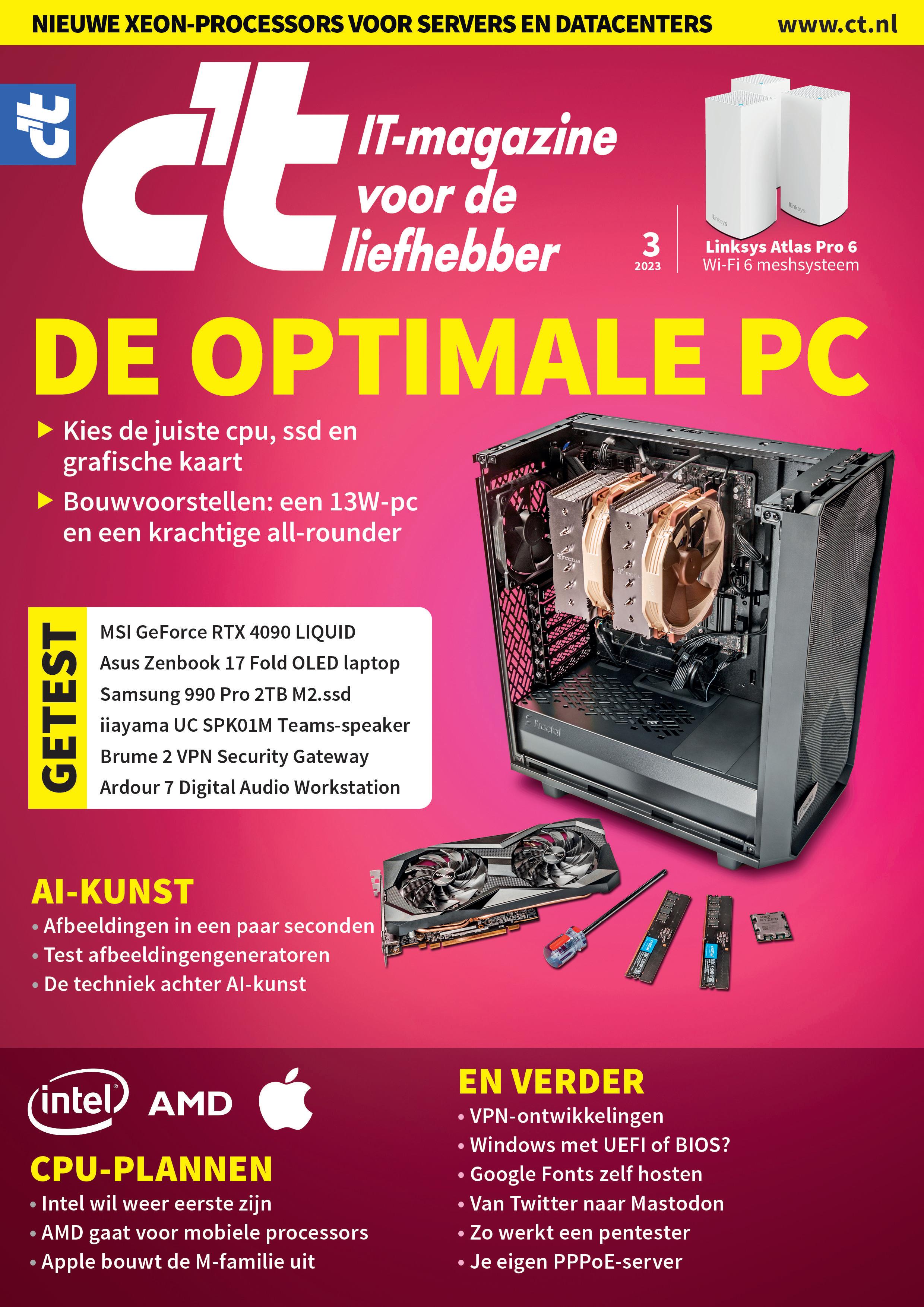 Thema’s De optimale pc 34 Koopadvies voor de belangrijkste onderdelen 42 Bouwvoorstel voor een 13 watt pc met Core i-12000/13000 46 Bouwvoorstel voor een high-end pc met Ryzen 7000 CPU-plannen 50 De roadmap van de chip- en cpu-fabrikanten tot 2026 AI kunst 64 Wat AI-beeldgenerators kunnen 68 Tips voor de beste resultaten met AI-generators 72 Zes AI-beeldgenerators getest 78 Hoe AI beelden genereert Nieuws 6 Algemeen 8 Hardware 10 Apple 12 Processors 14 Uitslag lezers-awards 2022 30 Lifestyle 32 Surftips Software 22 Ardour 7.2 DAW 31 Apps 33 Game: Evil West Hardware 16 Lezerspanel: Foscam S41 outdoorcamera 20 Linksys Atlas Pro 6 Wi-Fi 6 meshsysteem 20 Samsung 990 Pro M2.ssd 21 iiayama UC SPK01M conferentiespeaker 21 Tado T3+ slimme thermostaat 22 Elecrow CrowTail Starter Kit for Raspberry Pi 24 Intel NUC12 Pro NUC12WSKi7 25 MSI Summit E16 Flip Evo A12MT laptop 25 MSI GeForce RTX 4090 SUPRIM LIQUID X 24G 26 Asus Zenbook 17 Fold laptop 28 GL.iNet Brume 2 VPN Security Gateway Zakelijk