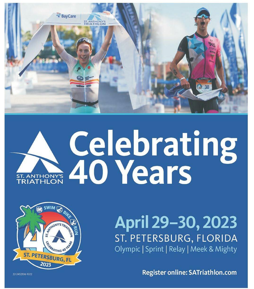 41 January/February flraceplace.com Use code FLRP for a discount on your entry fee. 22-2437370-1122 Register today: SATriathlon.com Olympic | Sprint | Relay | Meek & Mighty Where the World’s Best Come to Race. April 29–30, 2023 ST. PETERSBURG, FLORIDA