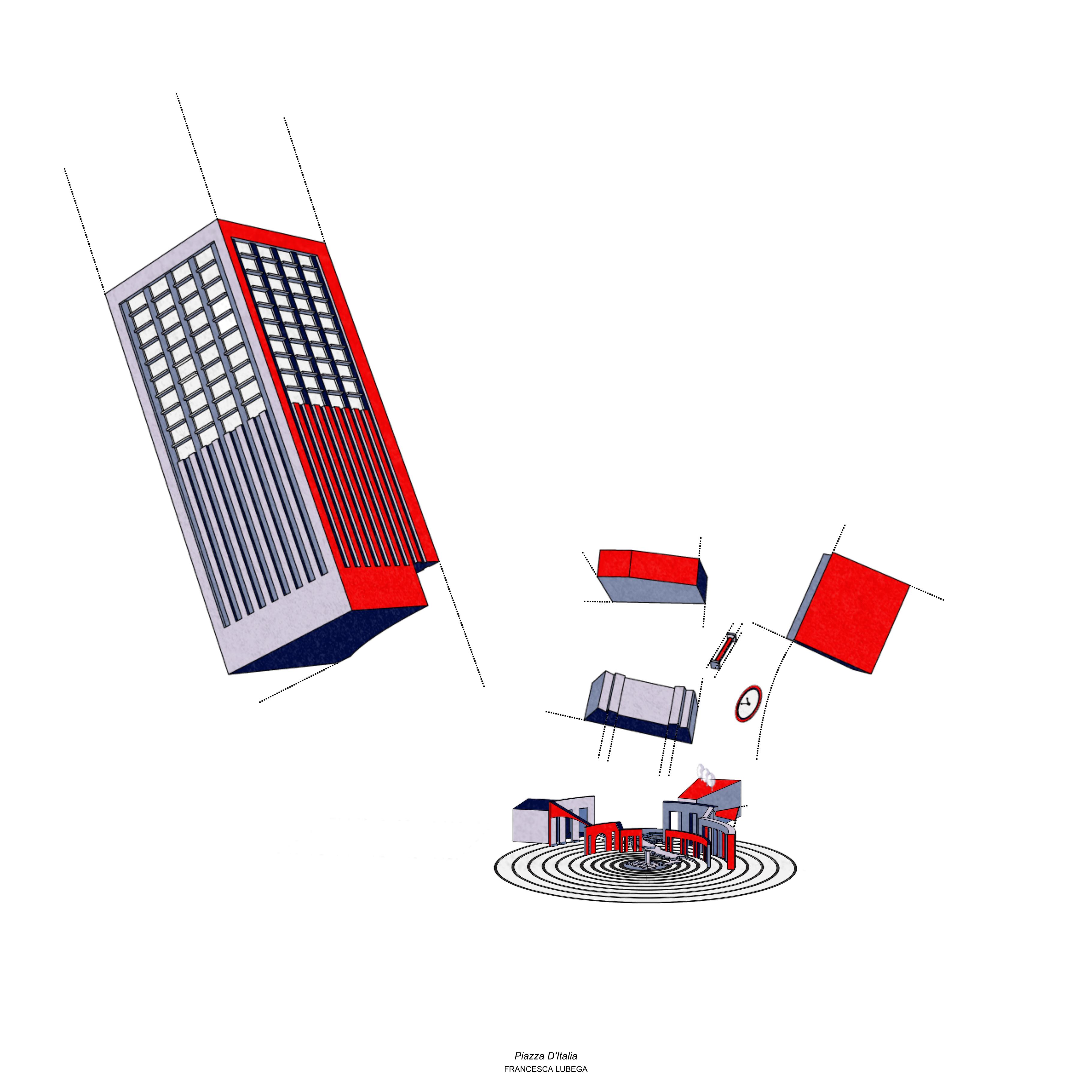 The purpose of this assignment was to use all of the skills and software learned in the Digital Media course. I used Rhino, V-Ray, Illustrator and Photoshop to complete this assignment. Piazza d’Italia was our site for speculation, mediation, and supposition. The task was to represent and construct a new identity for Piazza d’Italia in an illustration.