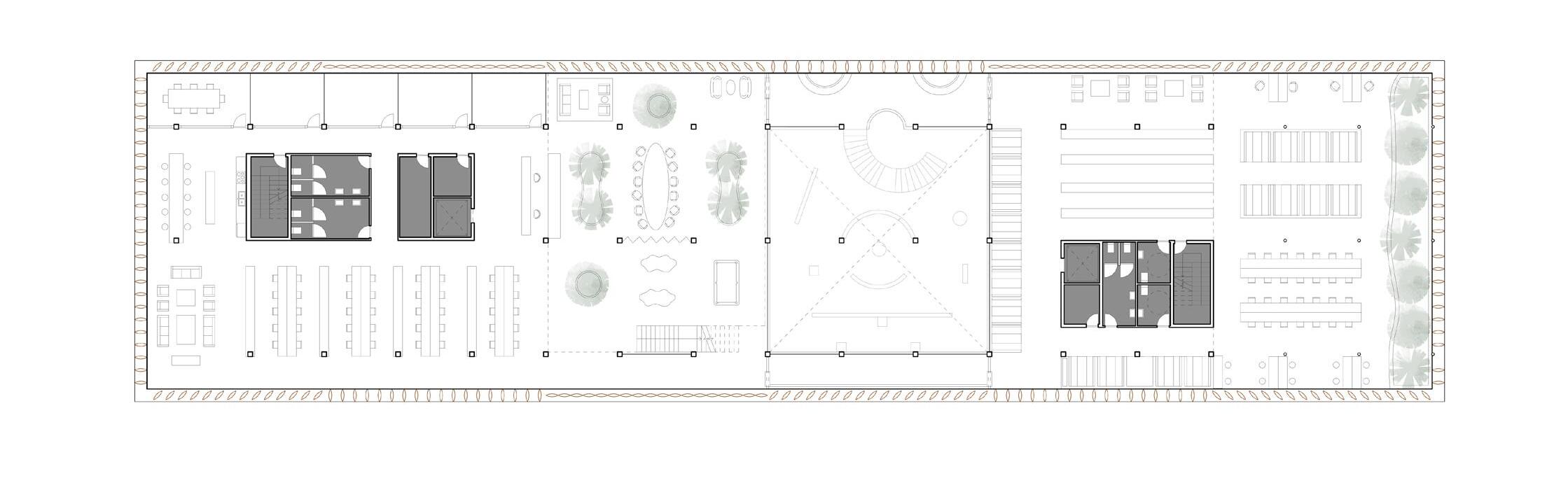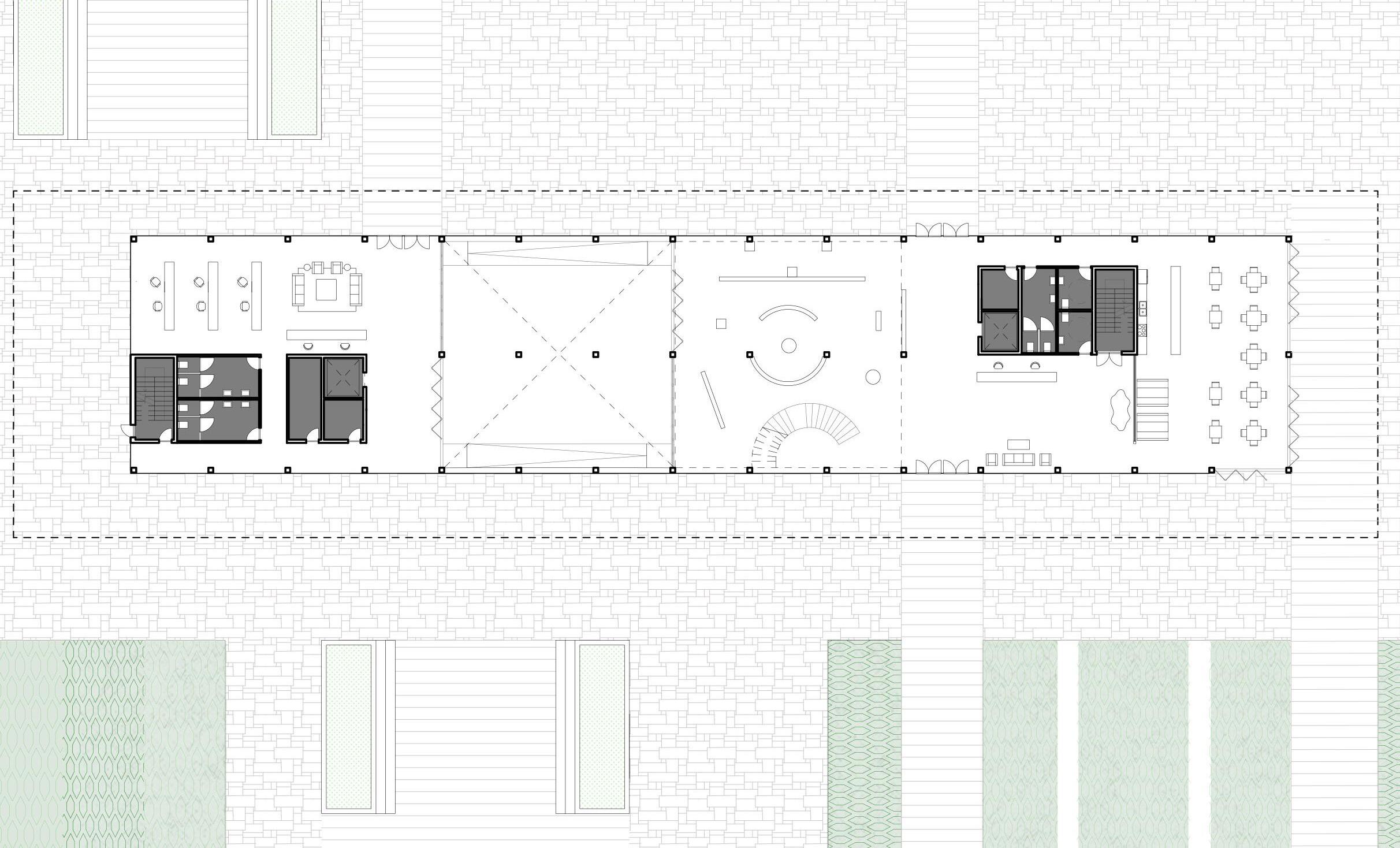 Located within the masterplan, I designed this dynamic hub as a creative getaway for LA artists. It features doubleheight meeting/seating spaces, strategically placed to separate library and office programs while fostering exchange and collaboration.