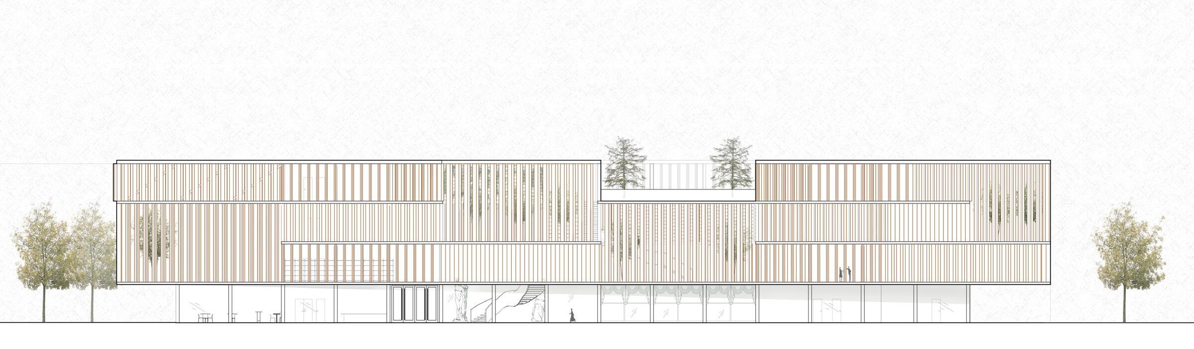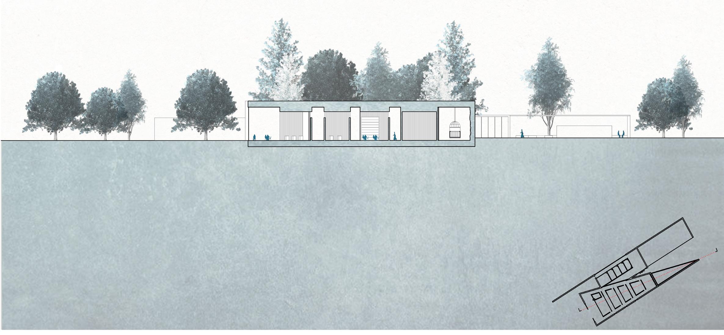 Years later and the railroad remains, covered in rubble. The education center becomes an extension of the railroad, using the axis of the pre-existing railroad to create a building which appears as two masses slipping past each other.