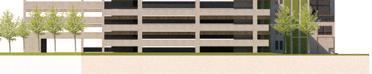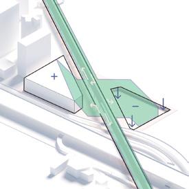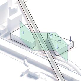 Mass design adapted for function: top zone pushed up for emphasis, lower public zone connects to parking building.