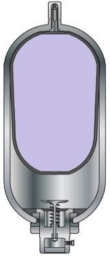 The liquid port communicates with the space between the outside of the rubber bladder and the inside of the pressure vessel. A spring-loaded poppet valve is placed in the liquid port to prevent the rubber bladder from extruding into the liquid port when it is pressurized.