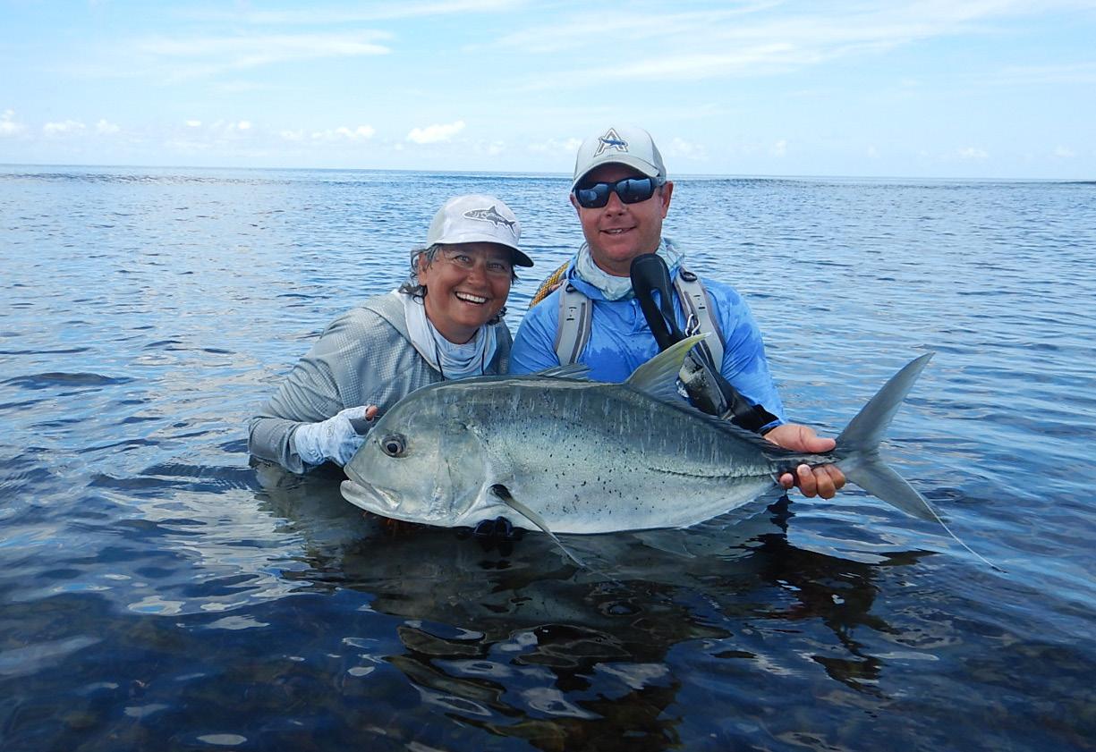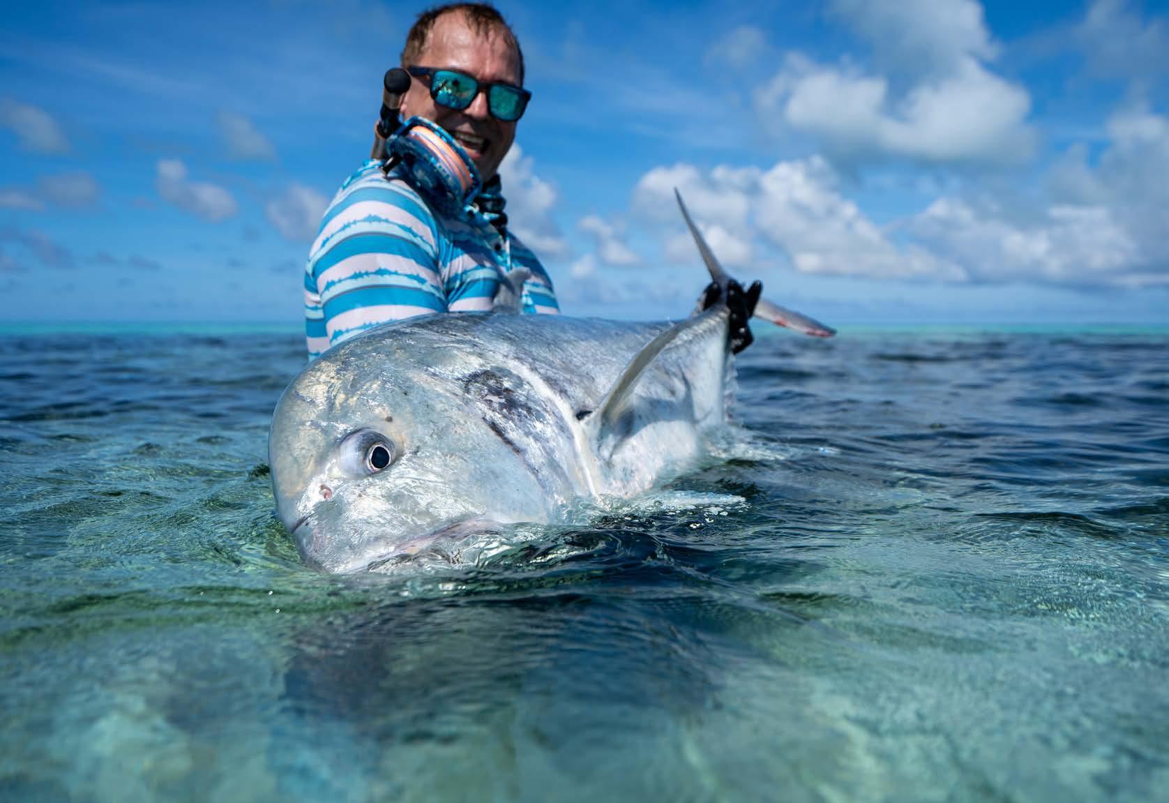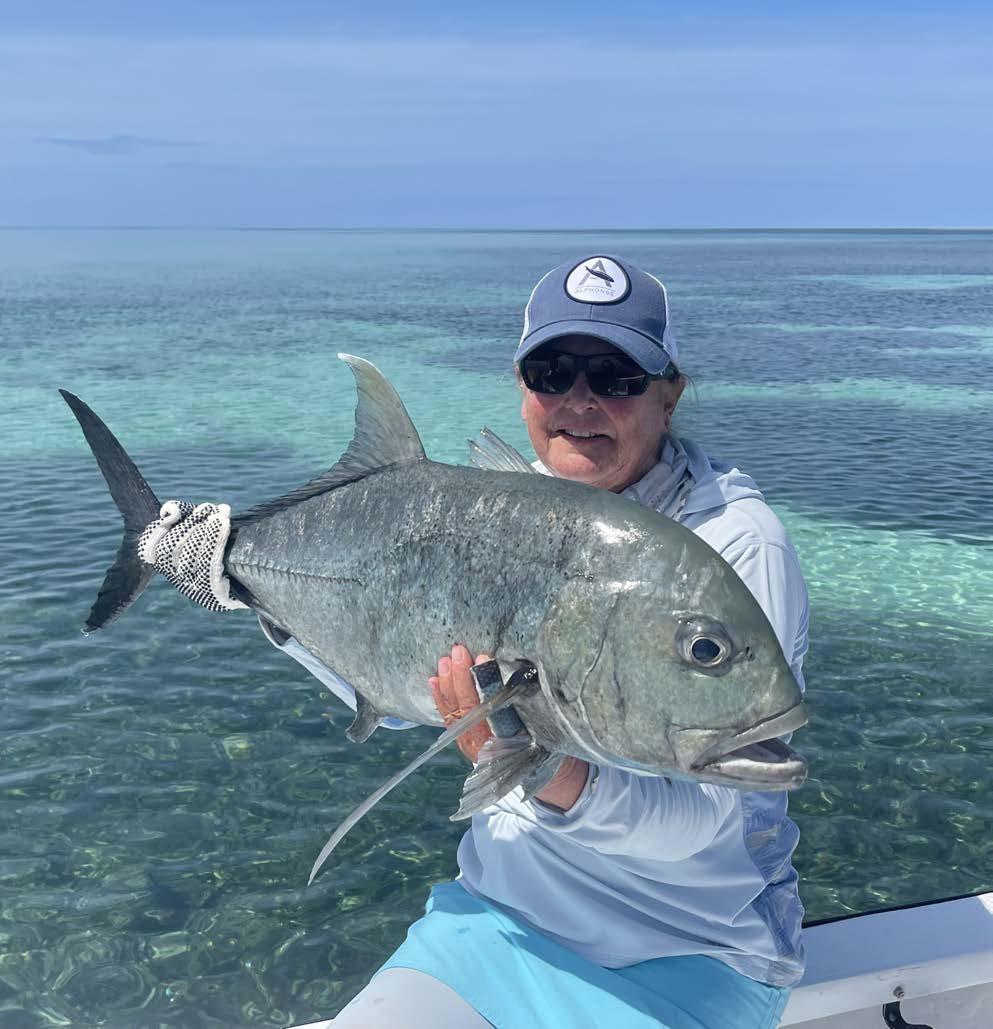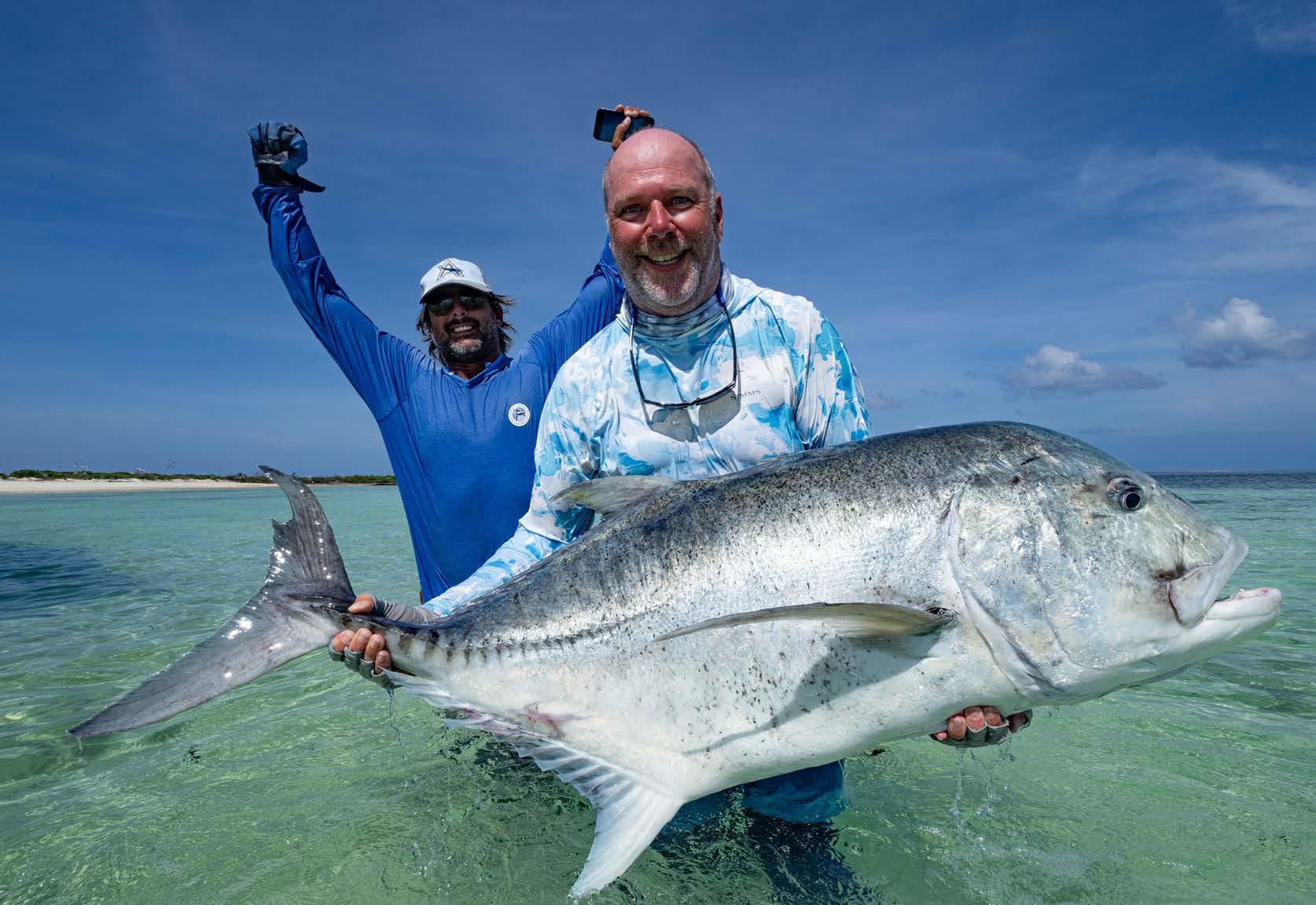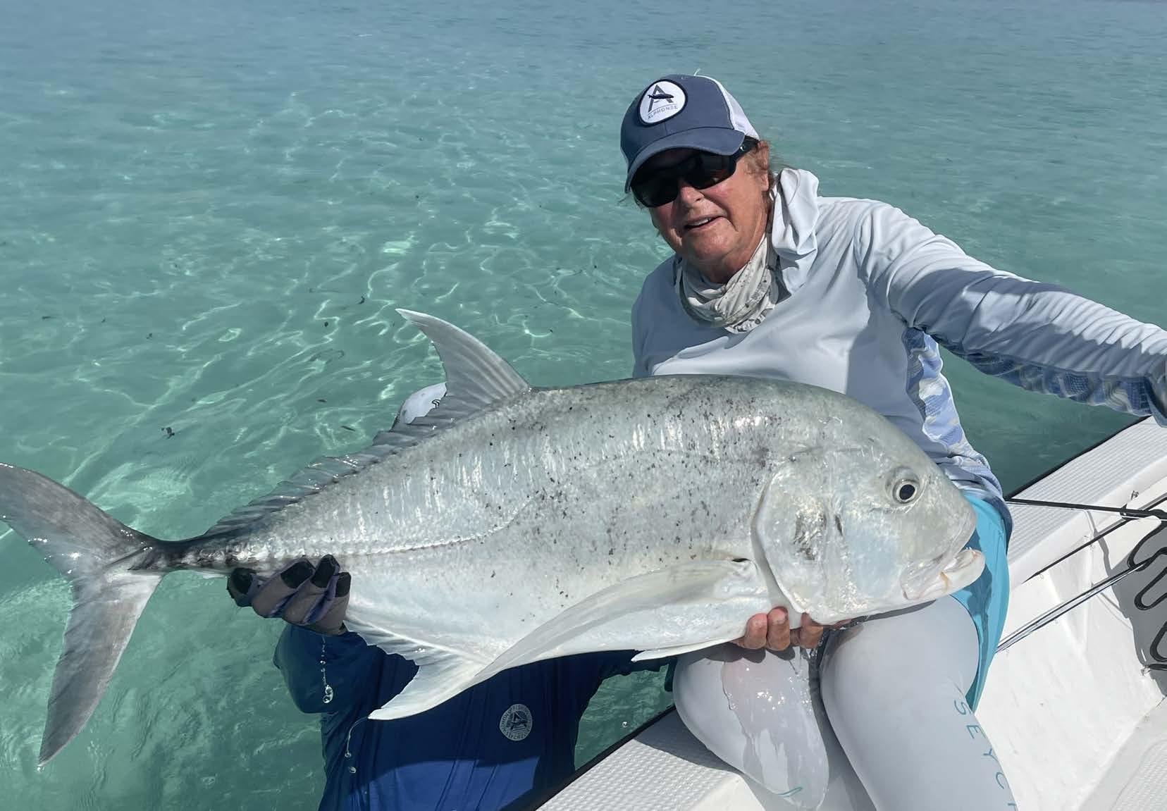 Bereits am ersten Tag gelang mir ein Grand Slam – ein Trigger, ein Bonefish und ein GT. Damit nicht genug – ich konnte noch acht weitere GT’s, darunter meinen persönlichen „Best Flats GT“ mit 130 cm fangen. Joanne Hessney fing einen mit 101 cm Länge. Insgesamt konnte unsere Gruppe zum Auftakt 32 GT’s landen.