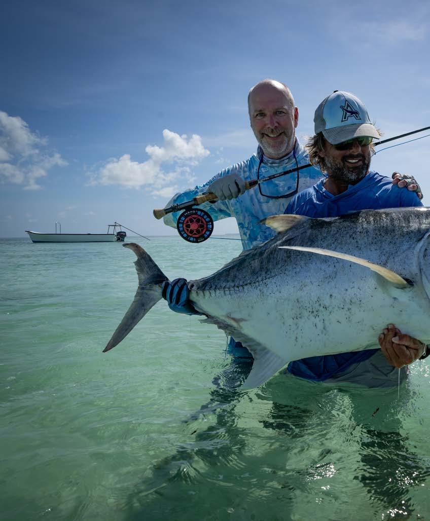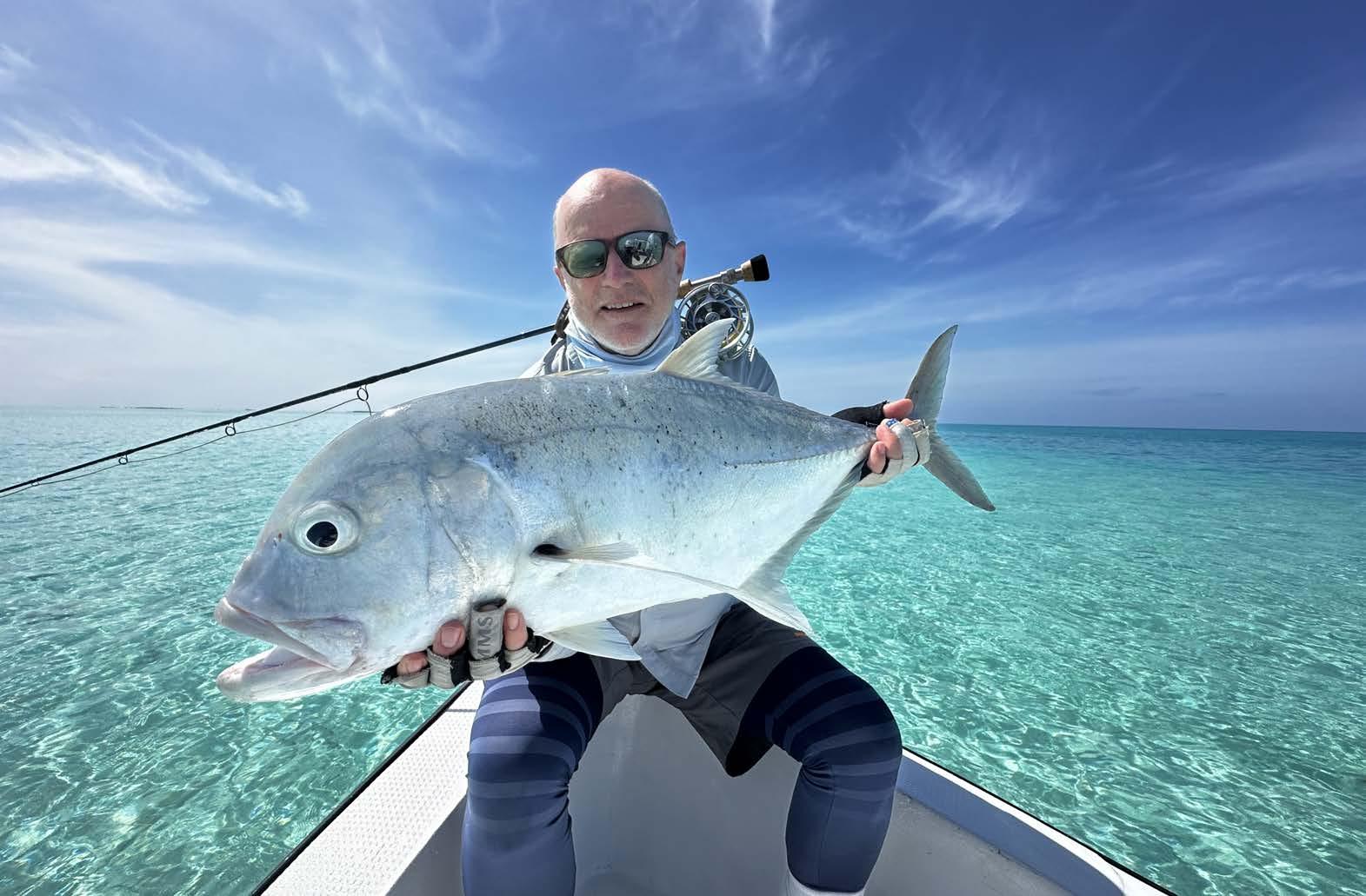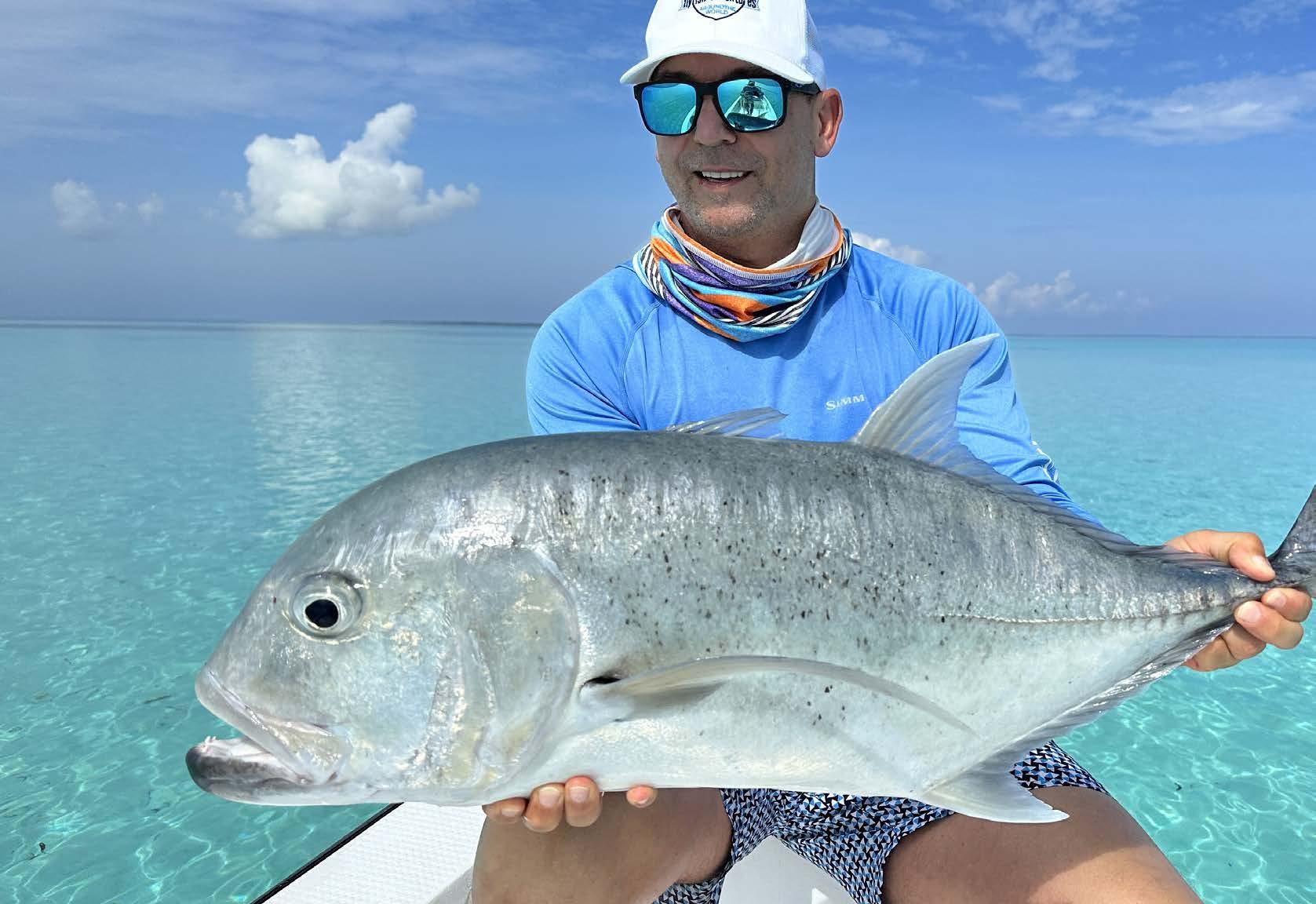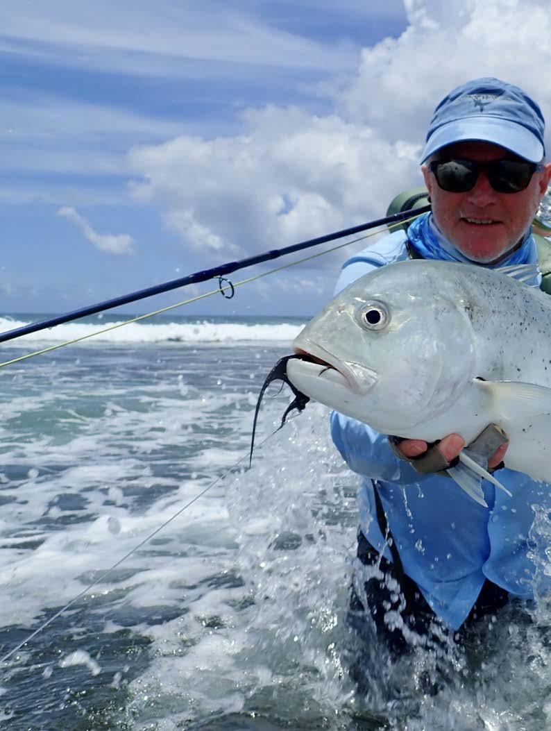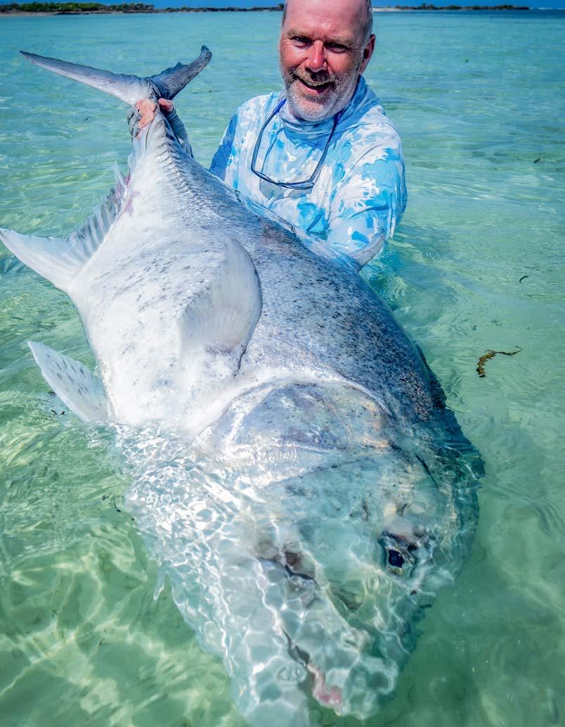 Bereits am ersten Tag gelang mir ein Grand Slam – ein Trigger, ein Bonefish und ein GT. Damit nicht genug – ich konnte noch acht weitere GT’s, darunter meinen persönlichen „Best Flats GT“ mit 130 cm fangen. Joanne Hessney fing einen mit 101 cm Länge. Insgesamt konnte unsere Gruppe zum Auftakt 32 GT’s landen.
