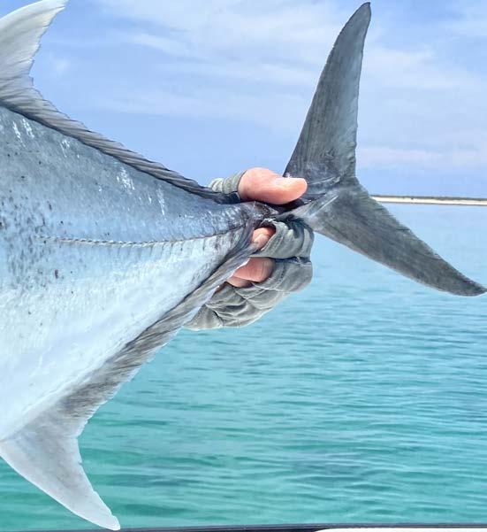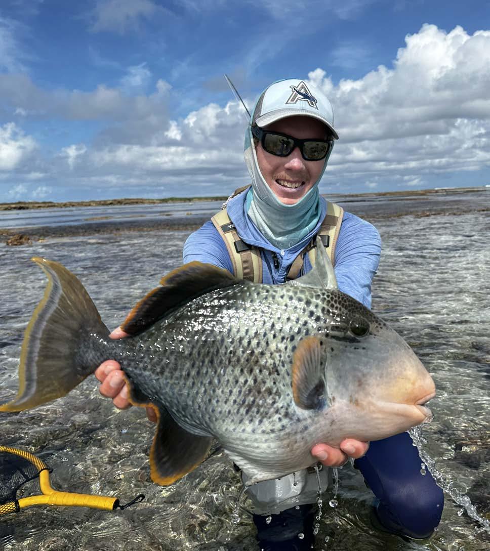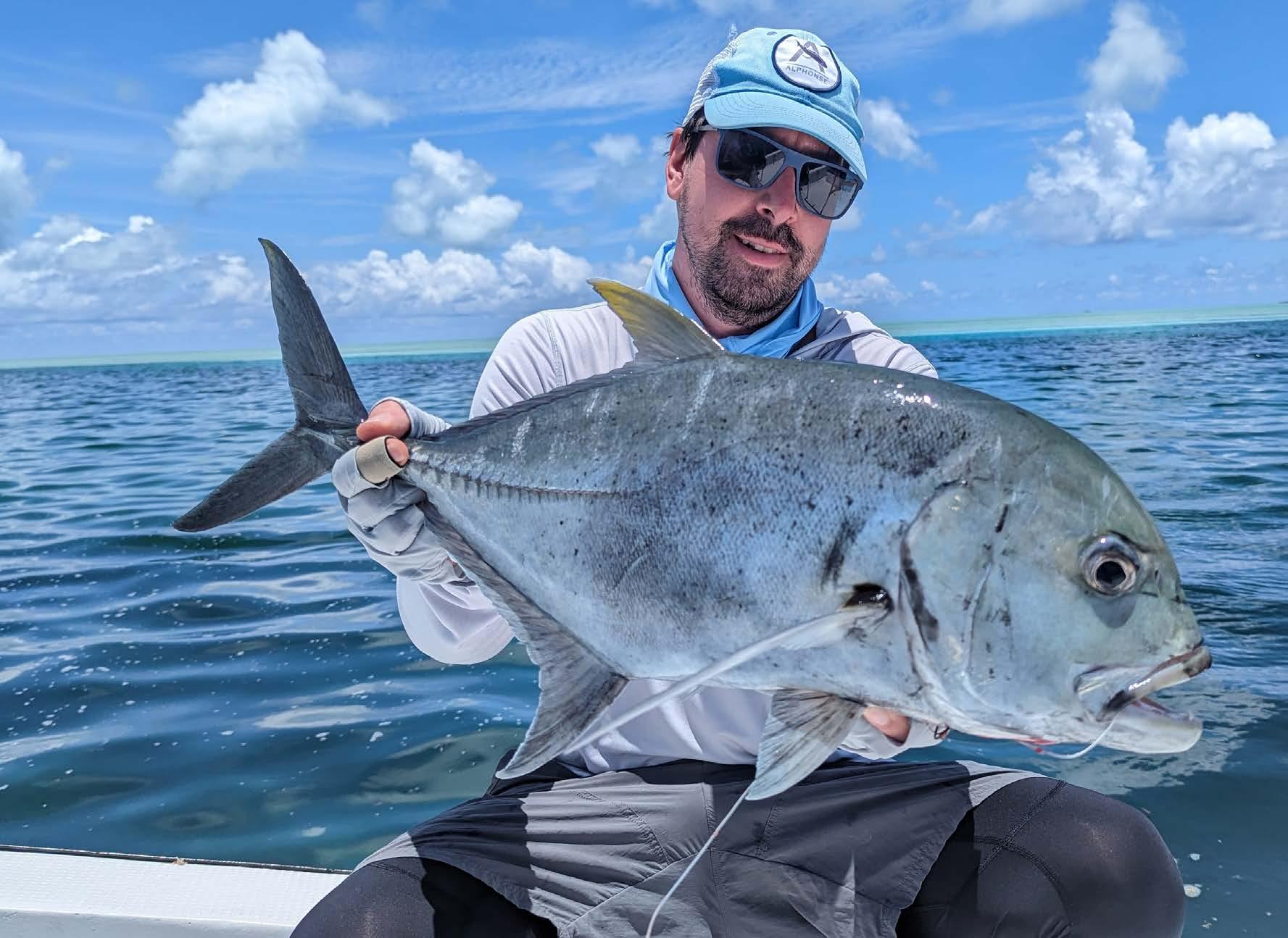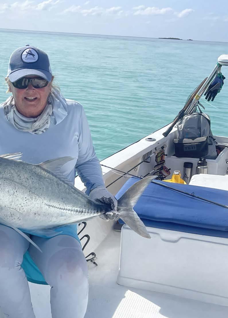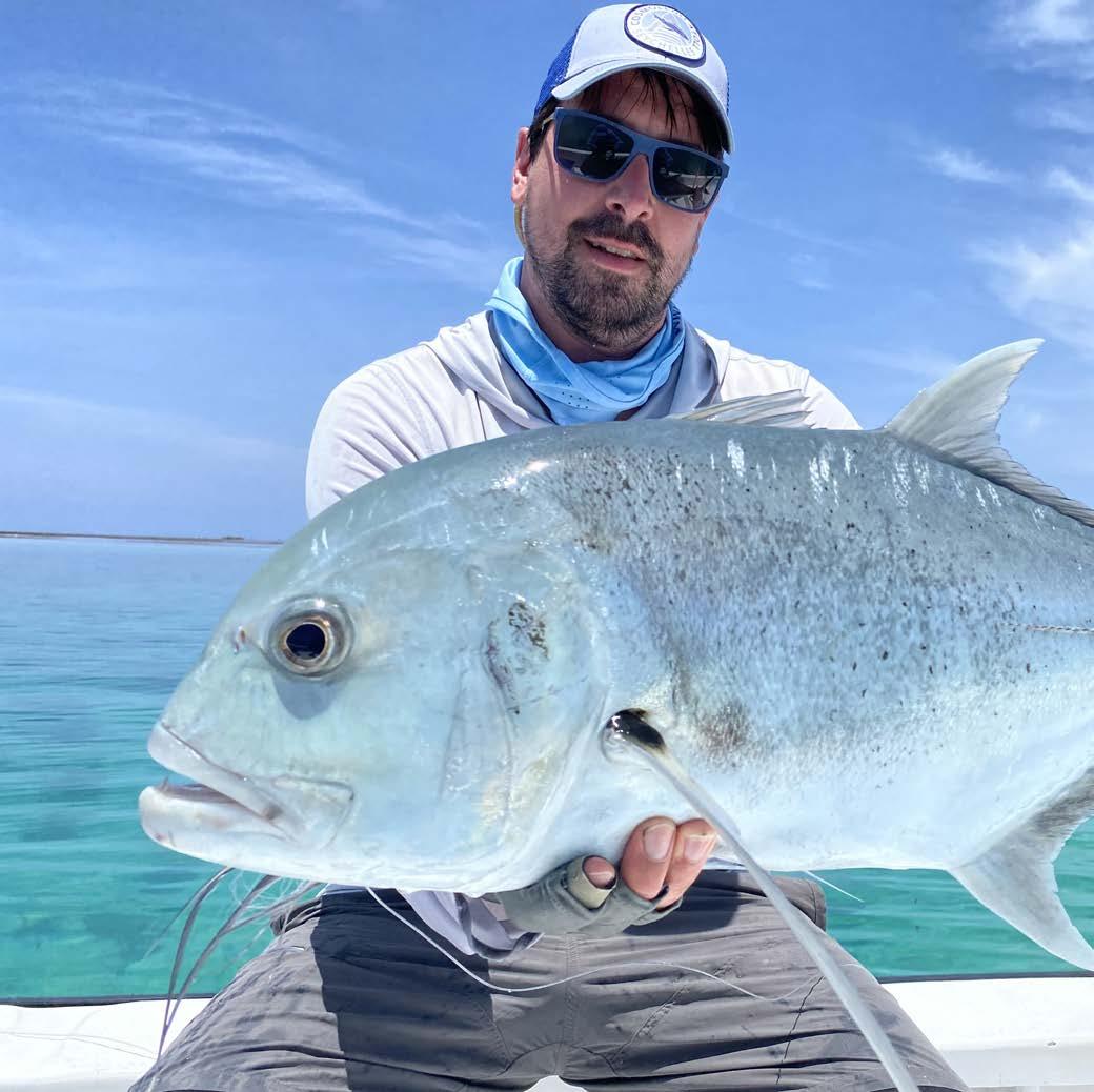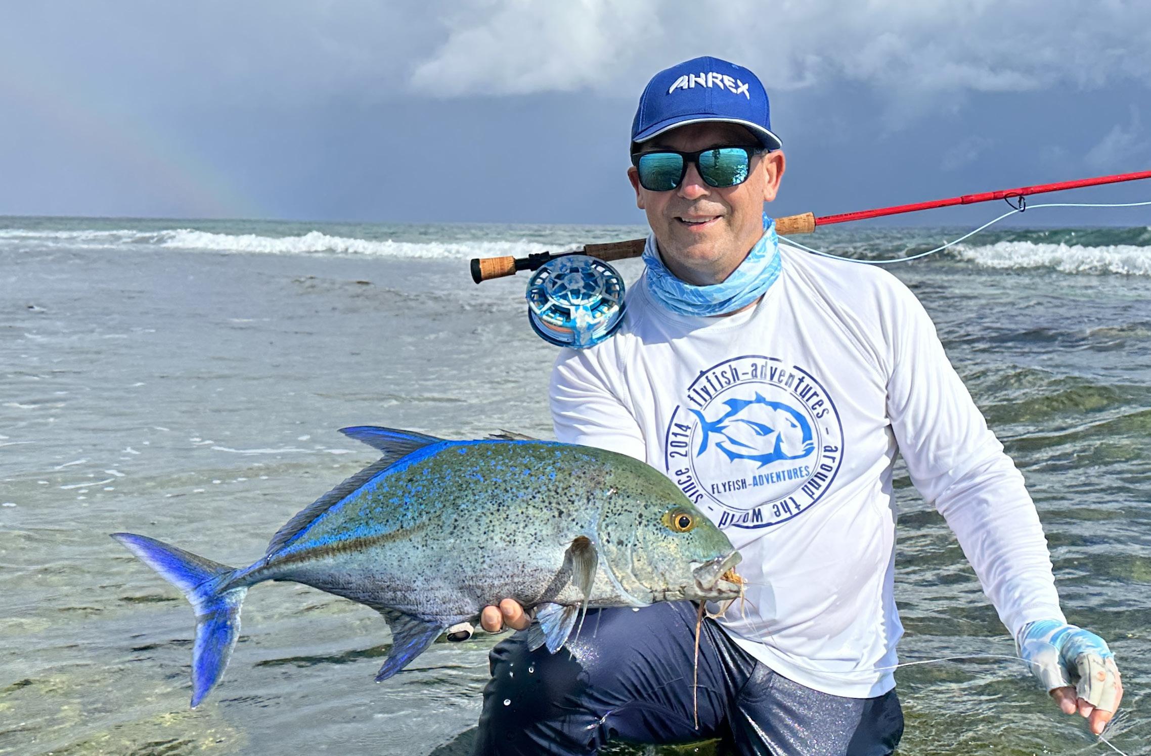 Bereits am ersten Tag gelang mir ein Grand Slam – ein Trigger, ein Bonefish und ein GT. Damit nicht genug – ich konnte noch acht weitere GT’s, darunter meinen persönlichen „Best Flats GT“ mit 130 cm fangen. Joanne Hessney fing einen mit 101 cm Länge. Insgesamt konnte unsere Gruppe zum Auftakt 32 GT’s landen.