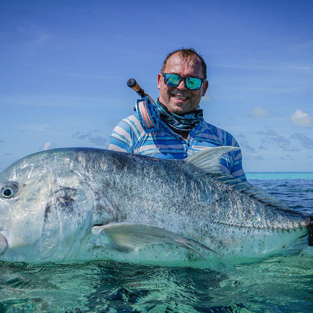 Already on the first day I managed a Grand Slam - a Trigger, a Bonefish and a GT. That‘s not all - I was able to catch eight more GT‘s, including my personal „Best Flats GT“ with 130 cm. Joanne Hessney caught one with 101 cm. Overall, our group was able to land 32 GT‘s at the start.