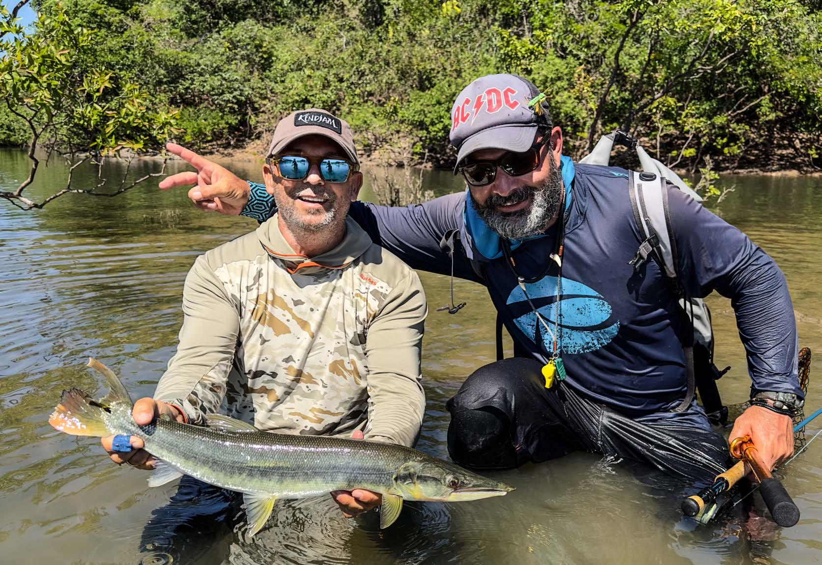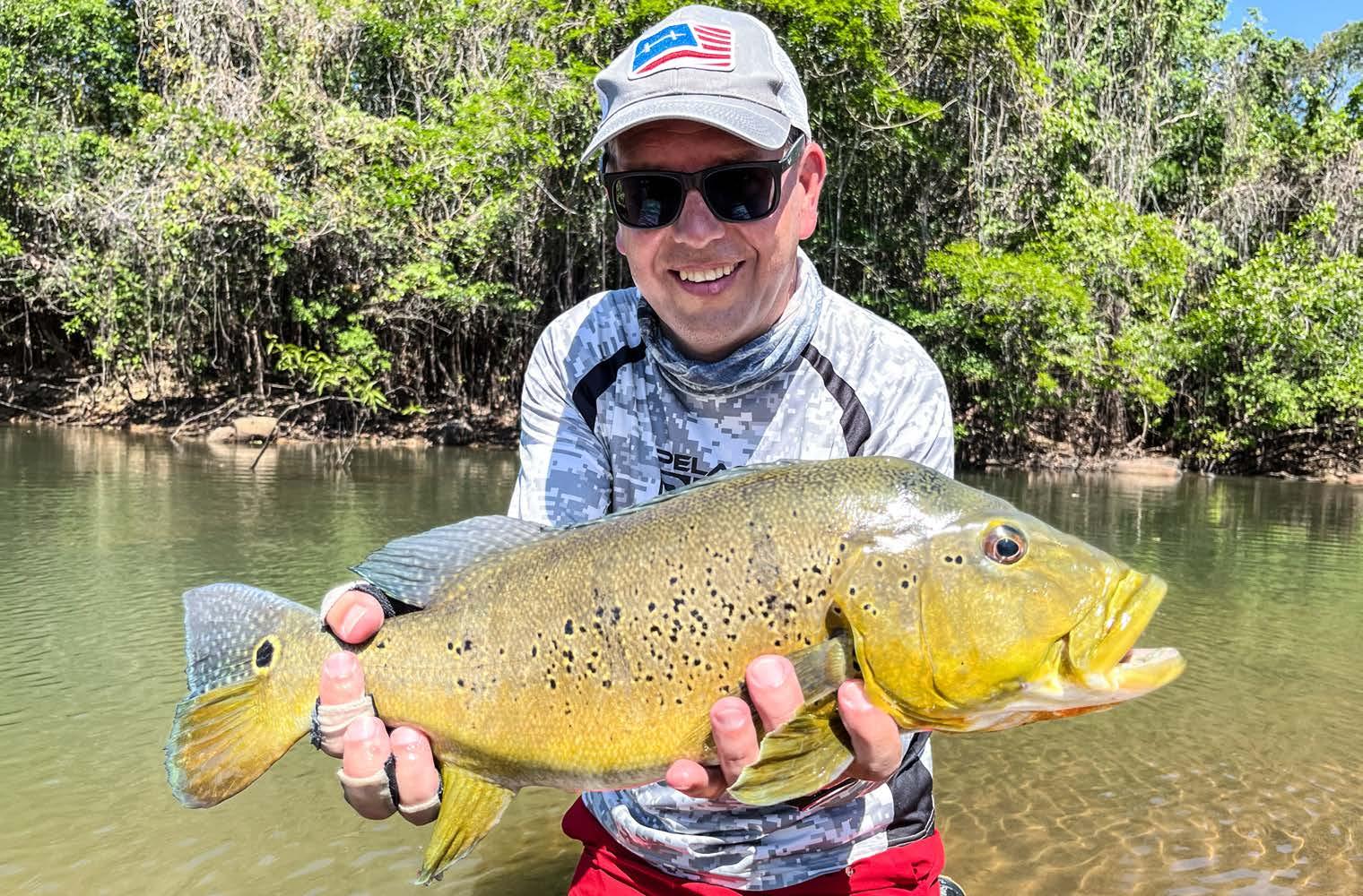 Each day of our adventure allowed us to catch seven to eight distinct fish species. The Iriri River boasts at least three known Pacu species, with the pacu leaping out of the water to snatch insects. We used dry flies, wets, and nymphs while wading upstream with 5-weight rods to catch them. We also pursued peacock bass with streamers, including an endemic species unique to the Iriri River basin. These bass are known for preferring moving water over stagnant pools and can reach impressive sizes of up to 20 pounds. Another thrilling species we encountered was the matricha, pound for pound the strongest fish in the jungle. They feed on fruit, flowers, insects, and other fish species, making them prime targets for dry fly fishing. Then, there were the Bicuda, resembling barracudas with their body shape and turbocharged tails, making them the speedsters of the Iriri River. These topwater predators were a joy to sight fish for.