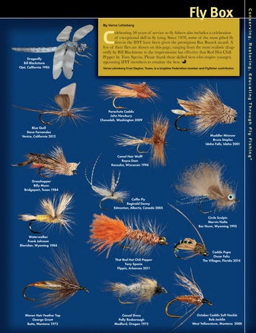 elebrating 50 years of service to fly fishers also includes a celebration of exceptional skill in fly tying. Since 1970, some of the most gifted fly tiers in the IFFF have been given the prestigious Buz Buszek award. A few of their flies are shown on this page, ranging from the most realistic dragonfly by Bill Blackstone to the impressionist but effective that Red Hot Chili Pepper by Tony Spezio. Please thank these skilled tiers who inspire younger, upcoming IFFF members to emulate the best.