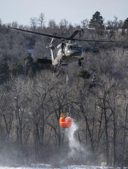 The U.S. Army Corps of Engineers committed to reducing flows from Garrison Dam upstream of an ice jam causing minor flooding on the Missouri River in Bismarck-Mandan, as state agencies coordinated with local and federal partners on a whole-of-government response. By 3 p.m., the two NDNG UH-60 Black Hawks were activated. Each helicopter was equipped with a Bambi Bucket system, capable of holding 660 gallons of river water. The 5,000 lbs of water was then repeatedly dropped onto the ice. A 20 by 20-foot section of ice was dislodged on the first pass. Around 6 p.m., progress was made, and the ice began to move down the river. One hundred and eighteen buckets dropped over 70,000 gallons of water in four hours.