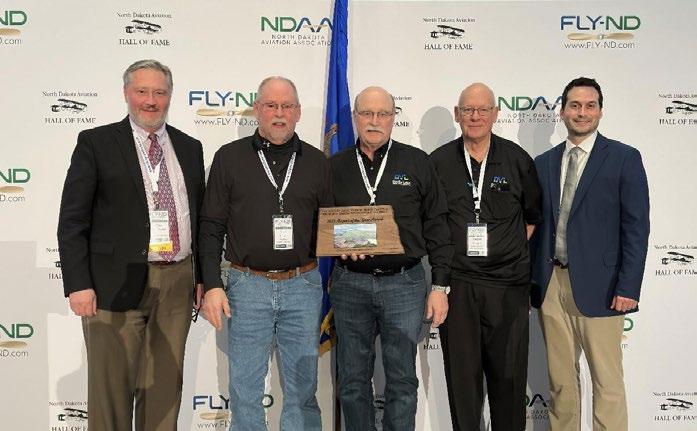 The Devils Lake Regional Airport receives the 2023 Commercial Service Airport of the Year award during the North Dakota Aviation Association's FLY-ND Conference awards banquet on March 5th, 2024. Pictured from left to right is Ryan Riesinger (President of the North Dakota Airport Association), Scott Cruse (DVL Airport Manager), Dennis Olson (Chair of the DVL Airport Authority), Rodger Haugen (Member of the DVL Airport Authority, and Kyle Wanner (Executive Director of the North Dakota Aeronautics Commission)