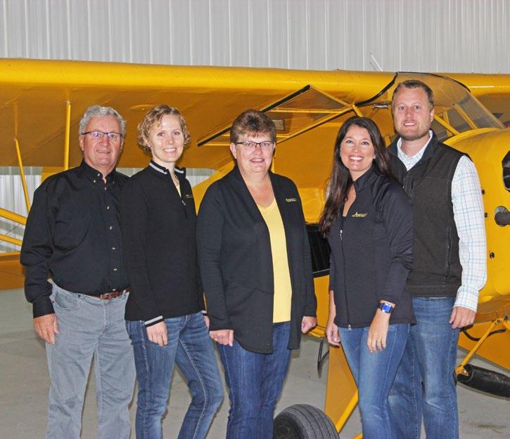 From left to right are Kyle Wanner, North Dakota Aeronautics Commission director, Nathan Sayler, Jim O’Day, Connie Hanson and Rodger Haugen. Sayler, O’Day, Hanson, Haugen and Ray Brooks (not shown) received the gold-level “Fly North Dakota Airports” Passport Program award.