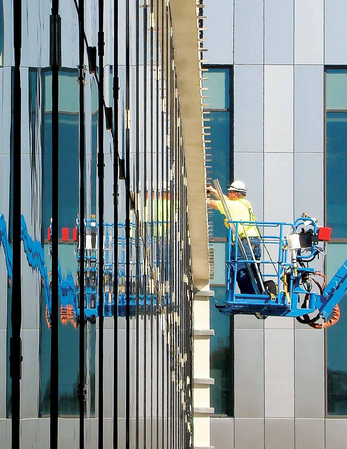 The crew has really done an outstanding job of maintaining a safe environment on a challenging project, while also meeting schedules and deadlines. There was limited access due to an underground gymnasium, so the team used the crane to set the framing and glazing for the 248foot long skylight. The scope also included curtain walls, storefronts, project-out windows, interior swing entrances, and heavy glass laminated guardrails.