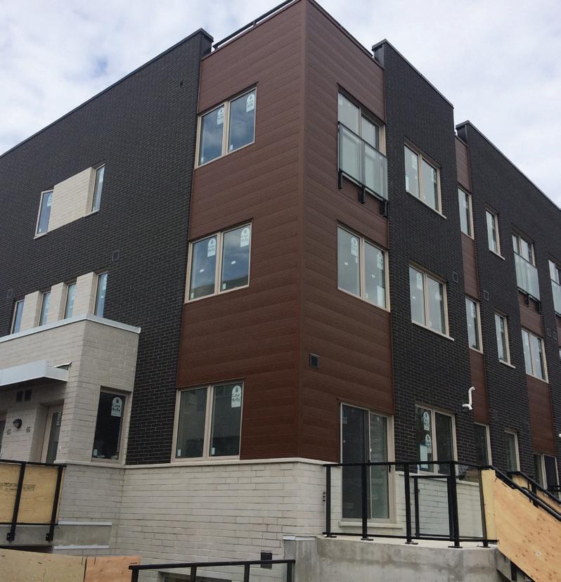 The crew in Edmonton is currently working on a recreation centre. The project involves 4,600 sq. ft. of of exposed fastener Trespa Phenolic panels, which are blue lagoon and amber in colour.