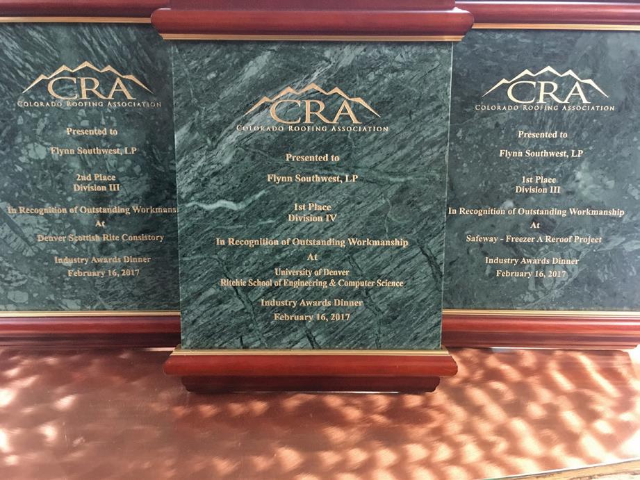 Flynn had a big night of recognition this year at the 2017 Colorado Roofing Association (CRA) Awards Dinner held February 16th, 2017. The Flynn Denver branch was proud to stand strong among the best of the best in award submissions for roofing projects amongst fellow competitors across Colorado. It is a great night to celebrate the achievements and professionalism of its members and highlight the many ways Colorado is striving to help positively improve the roofing industry. Members of the CRA can nominate a job based on the following categories, depending on the size of the contract.