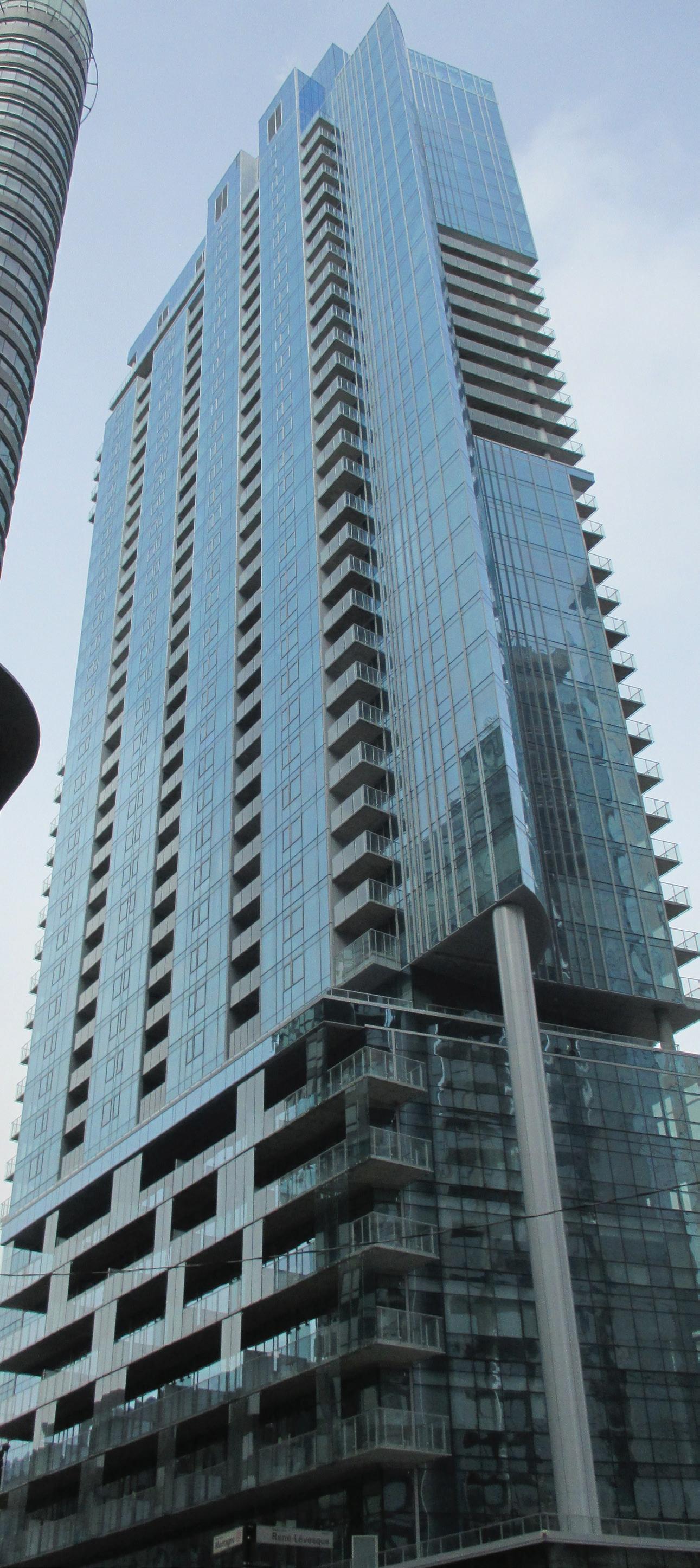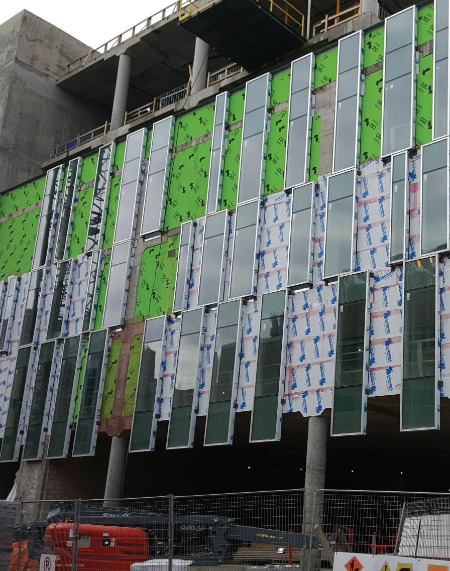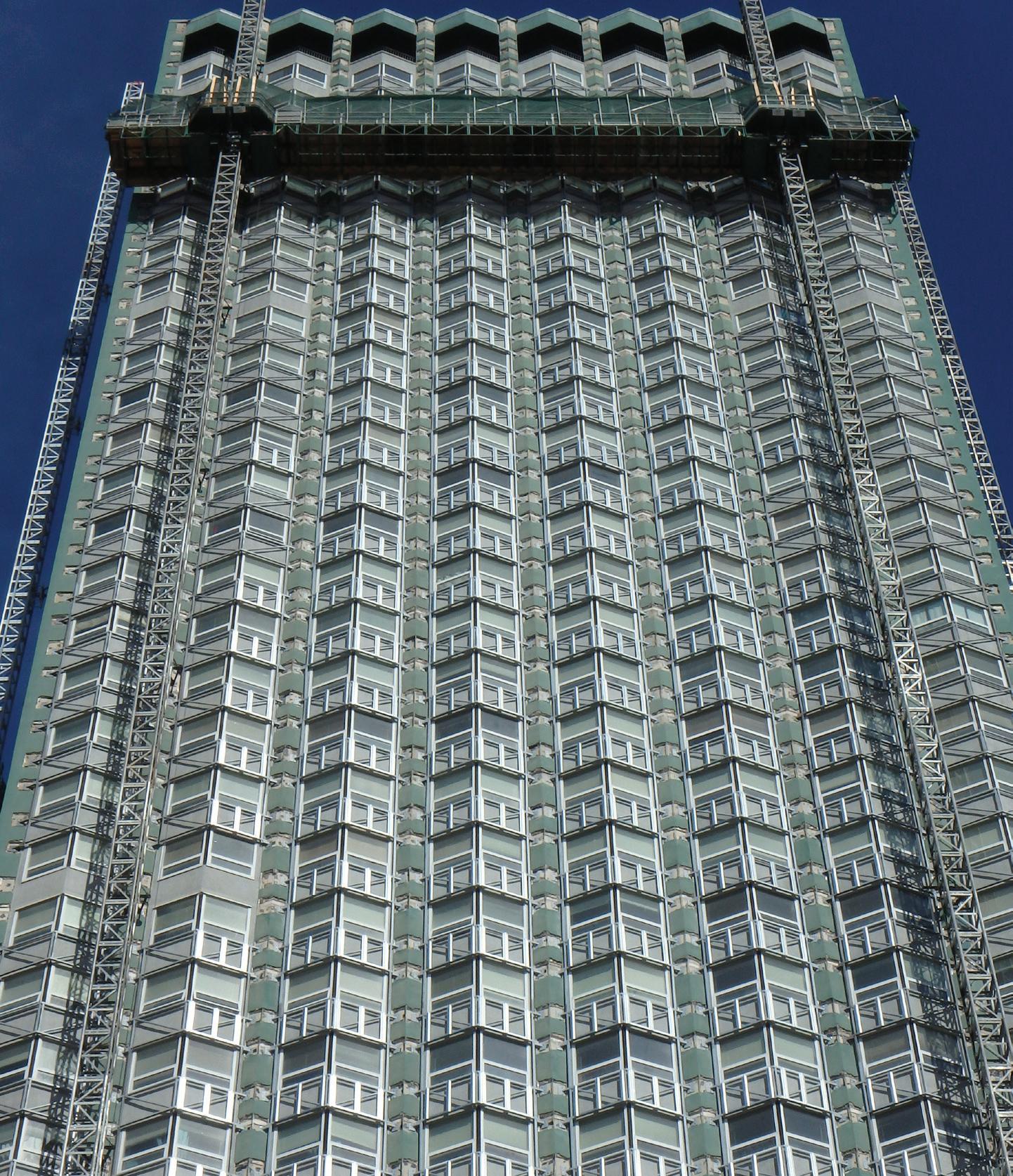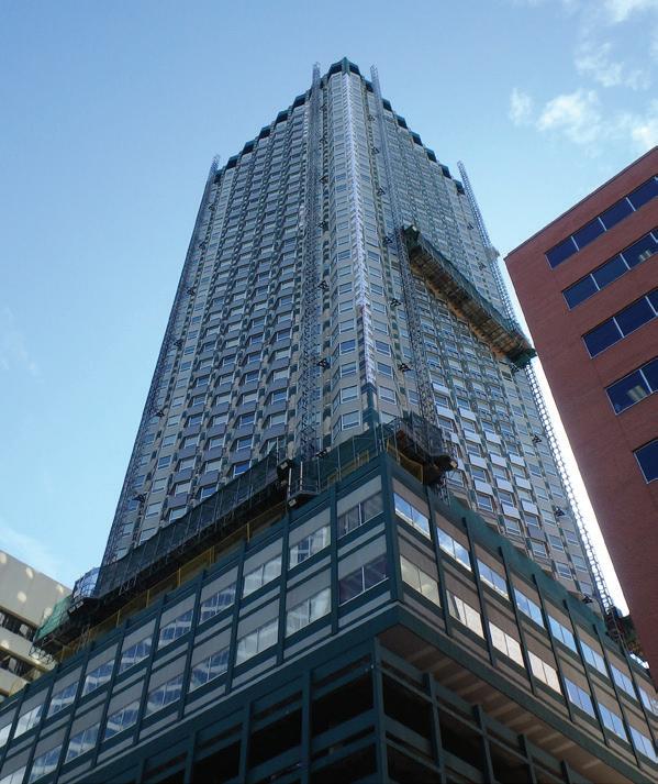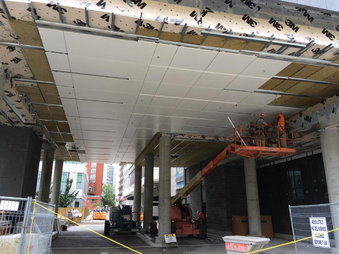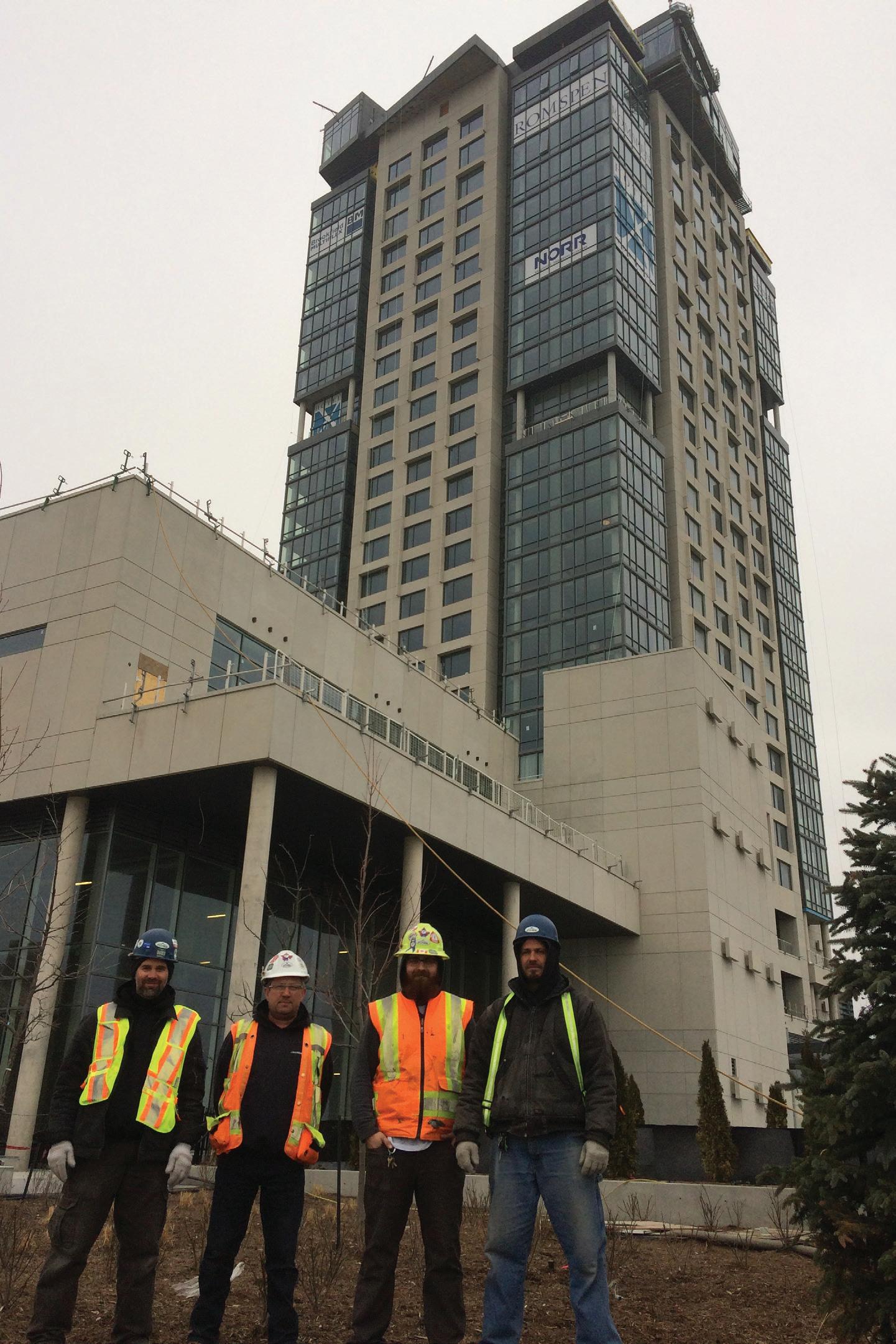 Flynn Canada is the prime contractor on the job for a tower retro fit. There are 29 floors of aluminum hidden fastener panels and composite metal panel on the job. Flynn Canada performed asbestos abatement work to prep structural base plate locations for structural frames which are installed by our structural steel subcontractor. All four sides of the building have been fitted with mast climbers and custom profiled platforms to accept the zig zag contour of the building. We have hired a full time safety representative to ensure all safety precautions and measures are followed by both Flynn Canada and Flynn Canada subcontractors on site.
