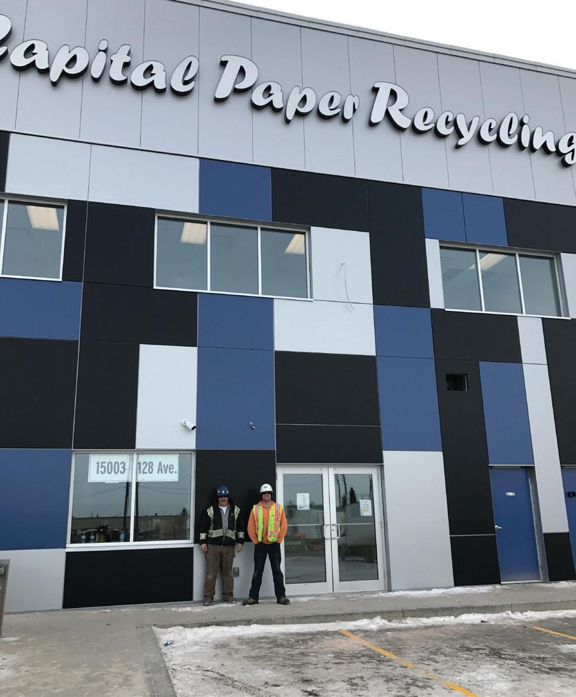 The team in Edmonton were working on the Capital Paper Recycling building. The scope of the project included 2,800 sq. ft. of multi coloured composite aluminum panels including wing walls and wing wall caps, plus 22,200 sq. ft. foam panels.