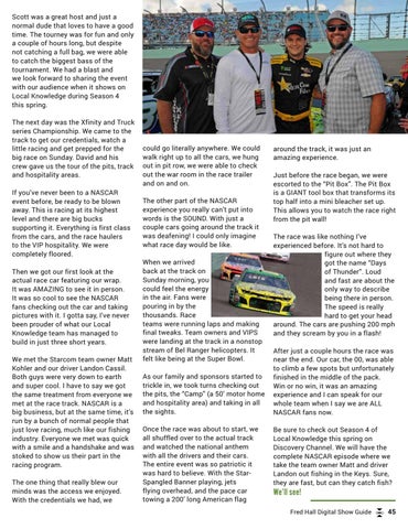could go literally anywhere. We could walk right up to all the cars, we hung out in pit row, we were able to check out the war room in the race trailer and on and on. The other part of the NASCAR experience you really can’t put into words is the SOUND. With just a couple cars going around the track it was deafening! I could only imagine what race day would be like. When we arrived back at the track on Sunday morning, you could feel the energy in the air. Fans were pouring in by the thousands. Race teams were running laps and making final tweaks. Team owners and VIPS were landing at the track in a nonstop stream of Bel Ranger helicopters. It felt like being at the Super Bowl. As our family and sponsors started to trickle in, we took turns checking out the pits, the “Camp” (a 50’ motor home and hospitality area) and taking in all the sights. Once the race was about to start, we all shuffled over to the actual track and watched the national anthem with all the drivers and their cars. The entire event was so patriotic it was hard to believe. With the StarSpangled Banner playing, jets flying overhead, and the pace car towing a 200’ long American flag