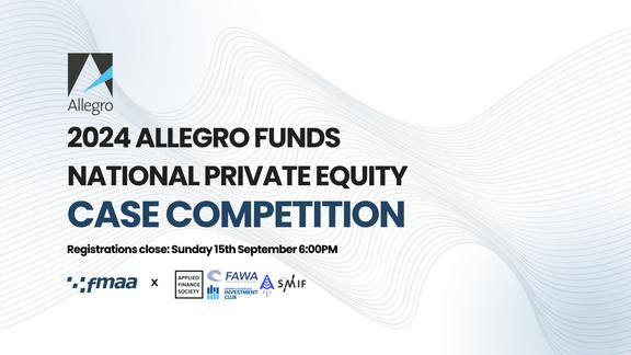 In this private equity case competition, students form groups of 3-4 to pitch a recommendation to an investment committee about a potential buyout Students from all degrees and majors are encouraged to participate. The winning team receives a cash prize of $1000 and impressive competitors are invited to interview for an internship at Allegro Funds. The best pre-penultimate team also receives a coffee chat with an Allegro Funds Deal team member.