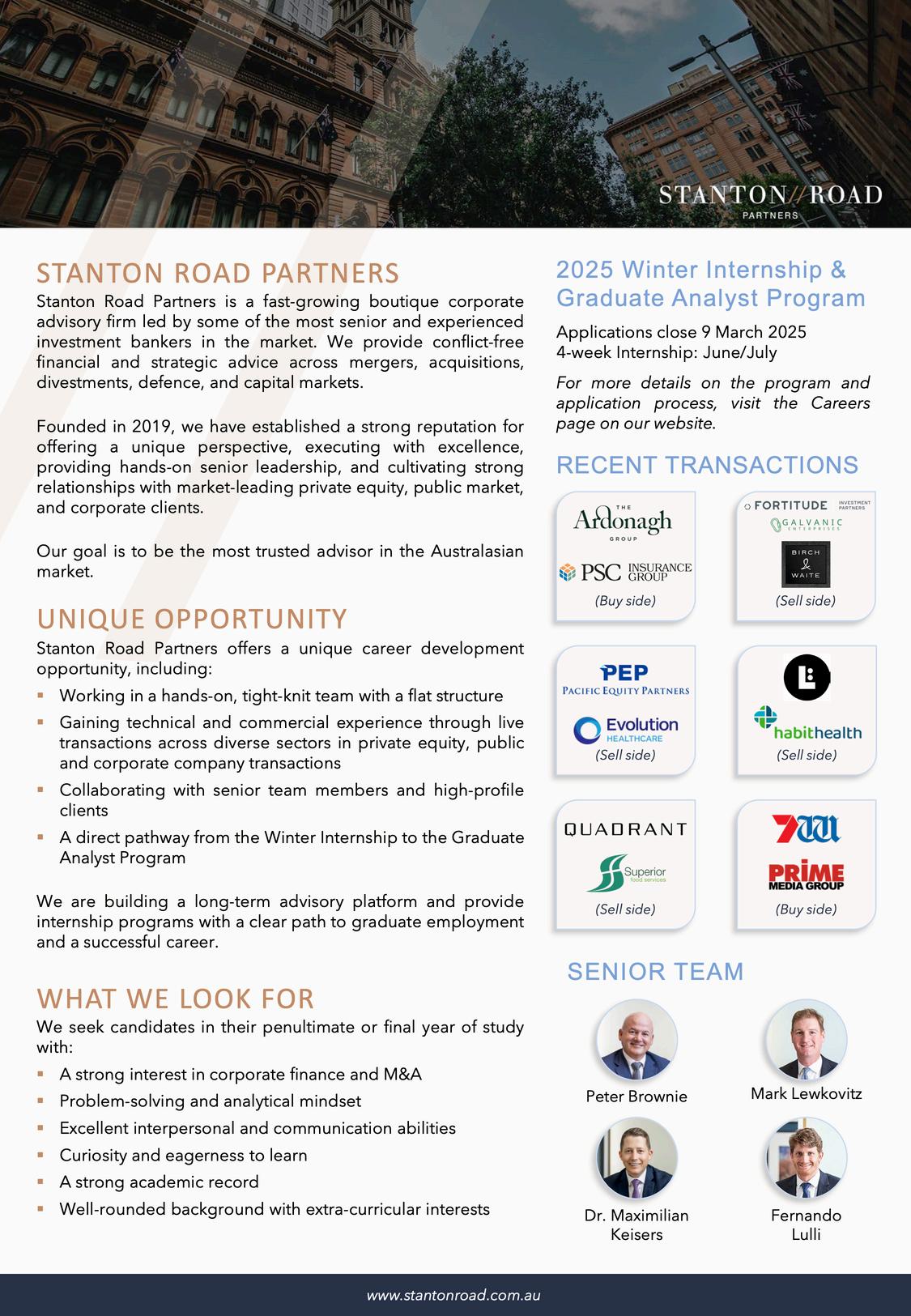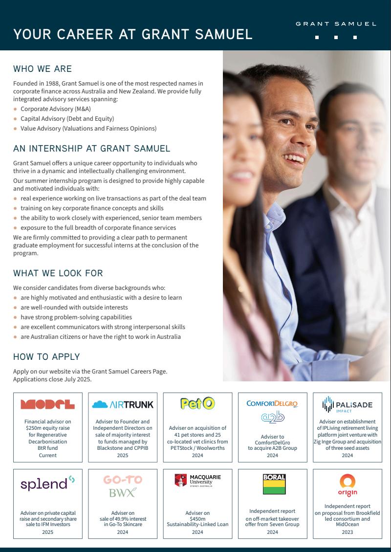 A career at Soul Patts offers continuous growth, empowering team members to develop key skills in financial analysis, strategic thinking, and leadership As you advance, you’ll take on greater responsibility, managing investments, leading analysis, and making informed, impactful decisions You’ll have the chance to build strong relationships within the team and with external advisors, deepen your expertise, and play a crucial role in shaping and elevating the Soul Patts brand.