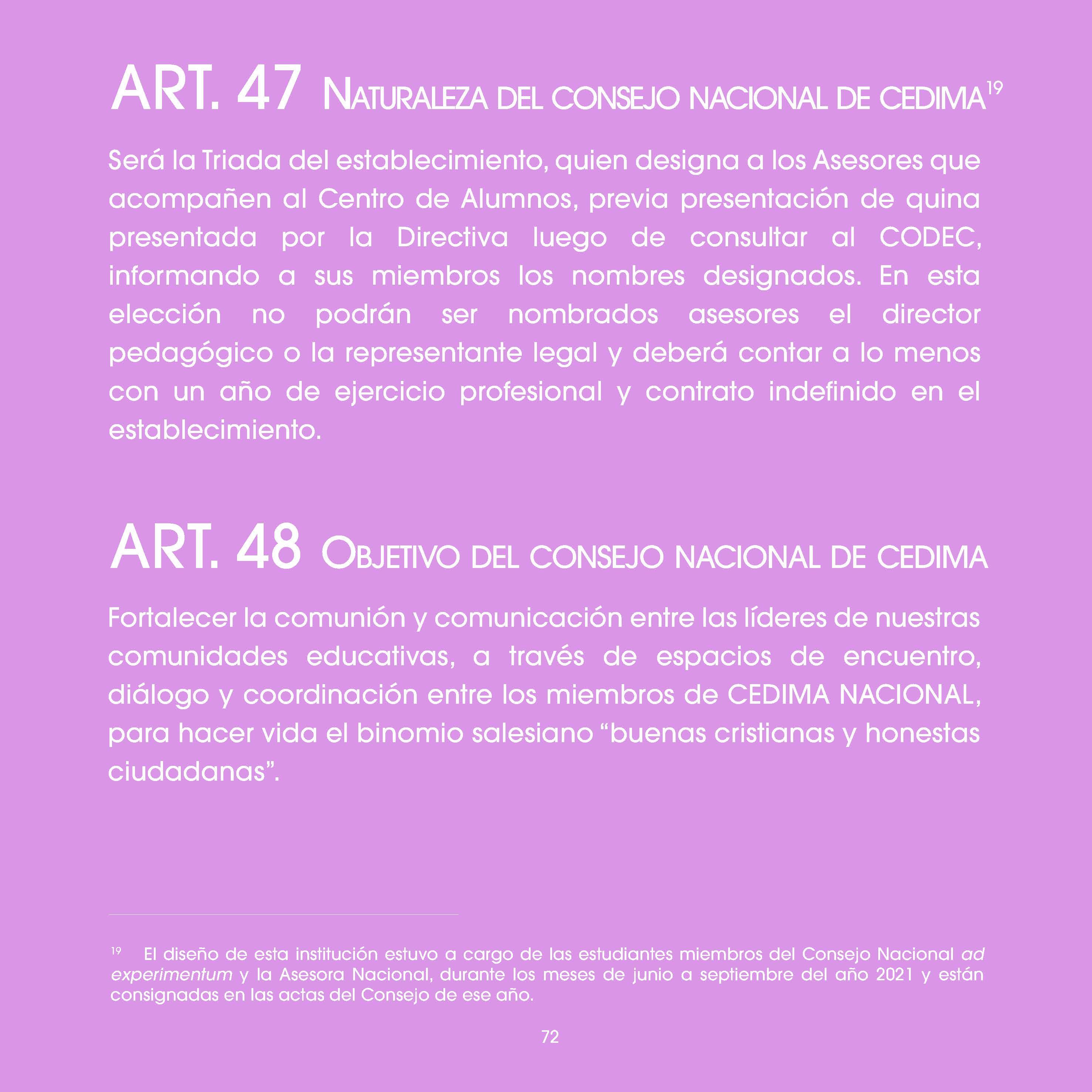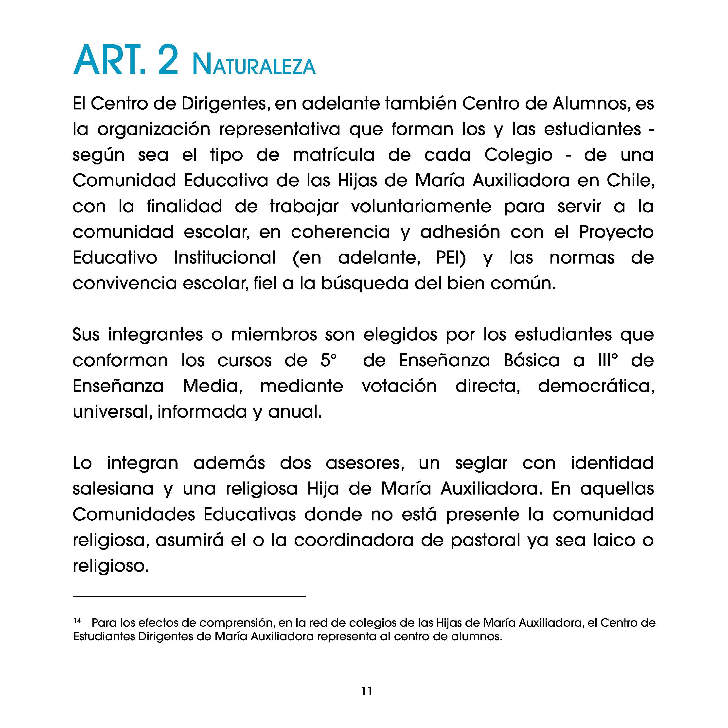 (Cf. ART 2) CEDIMA es la organización representativa que forman los y las estudiantes de una Comunidad Educativa de las Hijas de María Auxiliadora en Chile, con la finalidad de trabajar voluntariamente para servir a la comunidad escolar, en coherencia y adhesión con el Proyecto Educativo Institucional (en adelante, PEI) y las normas de convivencia escolar, fiel a la búsqueda del bien común.