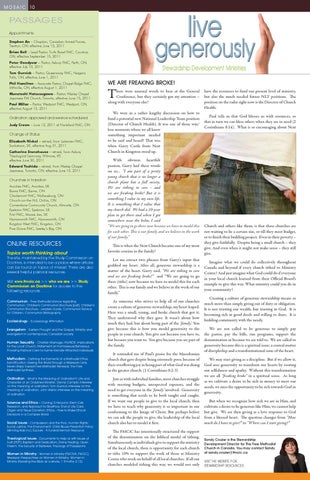 PASSAGES Appointments Stephen An – Chaplain, Canadian Armed Forces, Trenton, ON, effective June 15, 2011 Brian Bell – Lead Pastor, Trulls Road FMC, Courtice, ON, effective September 15, 2011 Peter Goodyear – Pastor, Asbury FMC, Perth, ON, effective July 10, 2011 Tom Gurnick – Pastor, Queensway FMC, Niagara Falls, ON, effective June 1, 2011 Phil Hamilton – Associate Pastor, Chapel Ridge FMC, Stittsville, ON, effective August 1, 2011 Munetoshi Hatsusegawa – Pastor, Wesley Chapel Japanese FM Church, Toronto, effective June 15, 2011 Paul Millar – Pastor, Westport FMC, Westport, ON, effective August 15, 2011