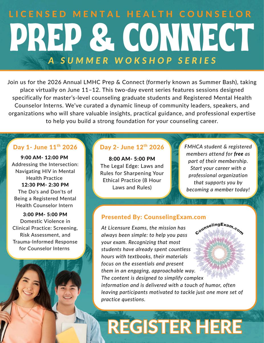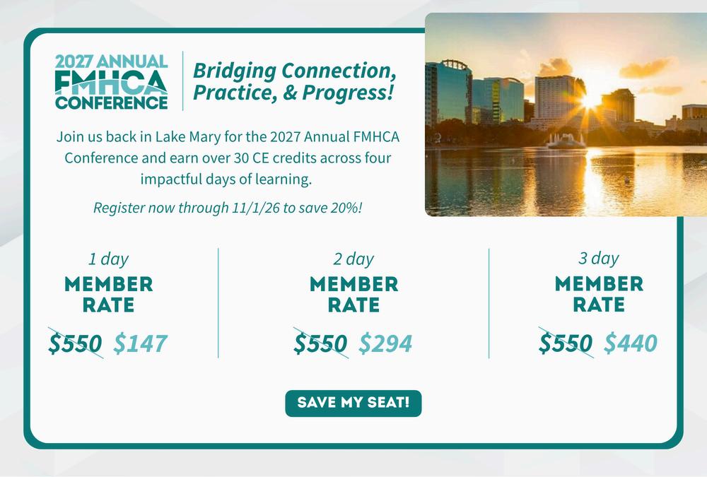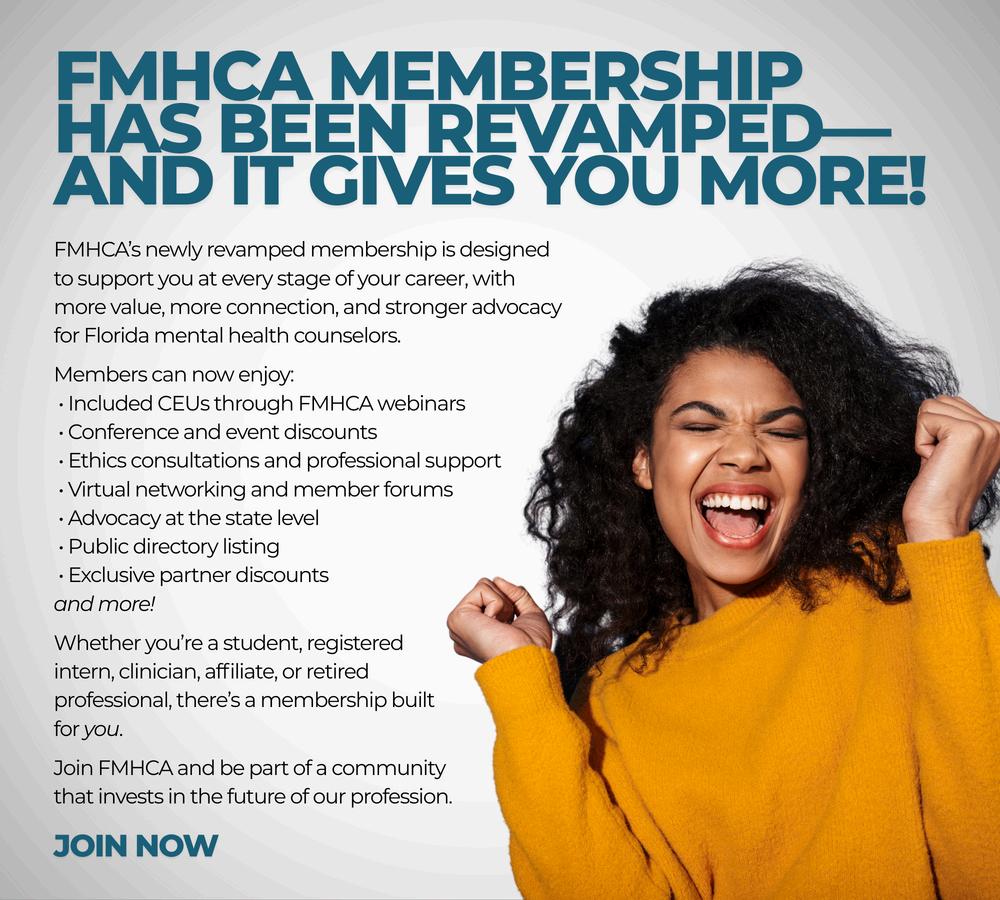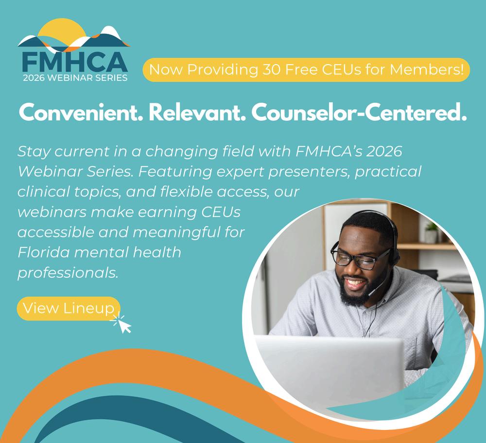 FMHCA is the only organization in the state of Florida that works exclusively towards meeting the needs of Licensed Mental Health Counselors in each season of their profession through intentional and strengthbased advocacy, networking, accessible professional development, and legislative efforts.
