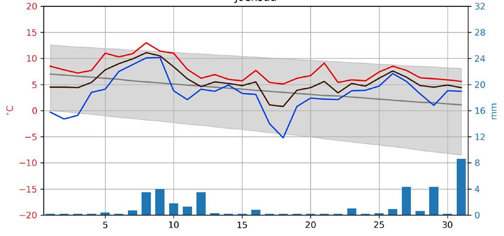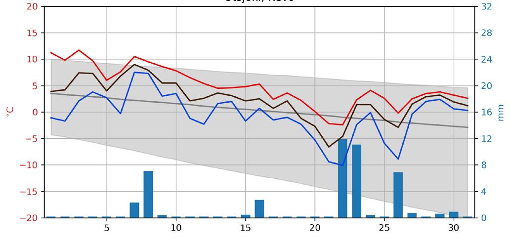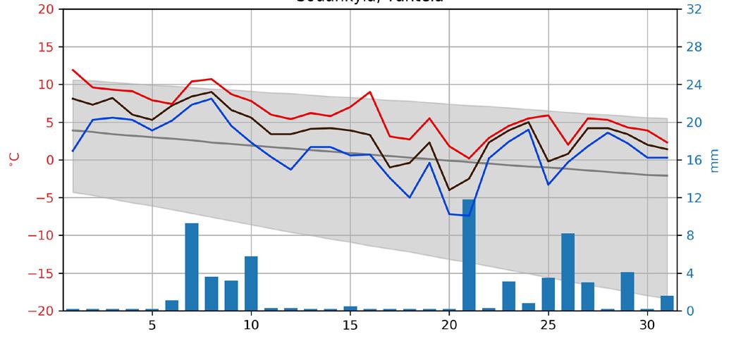 Lokakuussa 2025 päivittäin mitattu vuorokauden keskilämpötila (°C, musta käyrä), ylin lämpötila (°C, punainen käyrä) ja alin lämpötila (°C, sininen käyrä) sekä vuorokauden sademäärä (mm, siniset pylväät). Lämpötilan tasoitetut vertailuarvot ovat kaudelta 1991–2020. Harmaa käyrä kuvaa vuorokauden keskilämpötilan 50 %:n arvoa eli mediaania, ja harmaa varjostus kuvaa aluetta, jonka sisällä noin 97 % vuorokauden keskilämpötiloista tilastollisesti esiintyy.