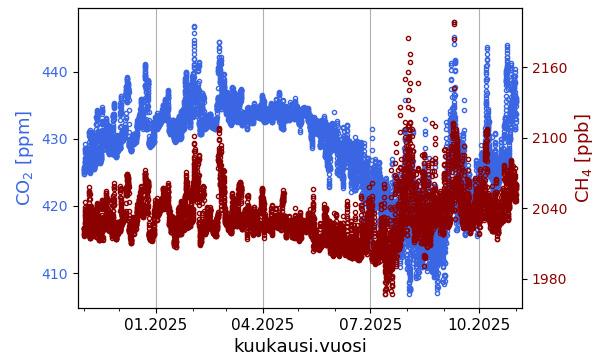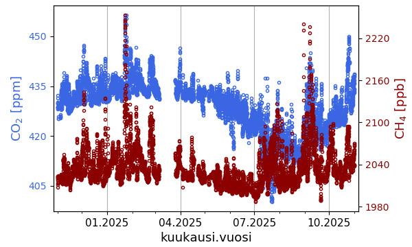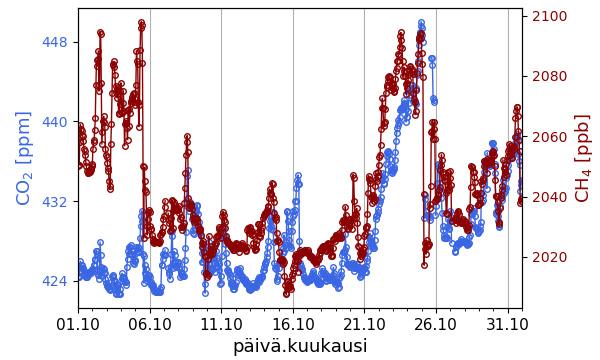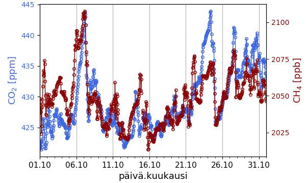Hiilidioksidi- (CO2) ja metaani- (CH4) pitoisuuksien havaitut tuntikeskiarvot viimeisen kuukauden jaksolla (ylin rivi) sekä viimeisen vuoden jaksolla (keskimmäinen rivi) Pallas-Sammaltunturin ja Utön asemilla. Alarivin kuvissa esitetään hiilidioksidipitoisuuden kehitys useamman vuoden ajalta.