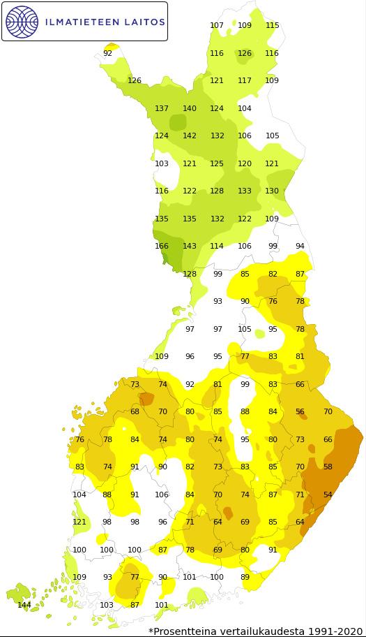 Maan keskivaiheilla puolestaan satoi monin paikoin keskimääräistä vähemmän, PohjoisKarjalassa paikoin vain puolet tavanomaisesta. Lokakuun pienin havaittu sademäärä oli Ilomantsin Mekrijärvellä mitattu 30,3 mm.